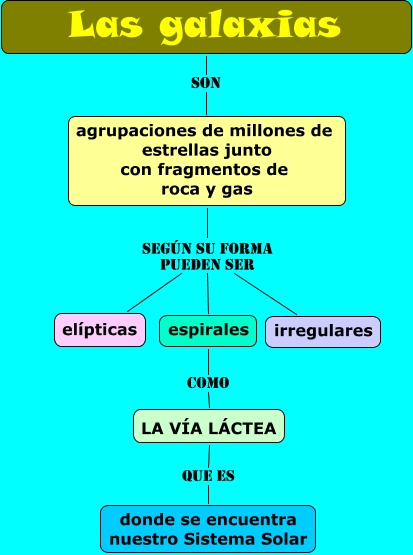 Este Cmap, tiene información relacionada con: Las galaxias, espirales como LA VÍA LÁCTEA, agrupaciones de millones de estrellas junto con fragmentos de roca y gas según su forma pueden ser irregulares, Las galaxias son agrupaciones de millones de estrellas junto con fragmentos de roca y gas, agrupaciones de millones de estrellas junto con fragmentos de roca y gas según su forma pueden ser espirales, agrupaciones de millones de estrellas junto con fragmentos de roca y gas según su forma pueden ser elípticas, LA VÍA LÁCTEA que es donde se encuentra nuestro Sistema Solar
