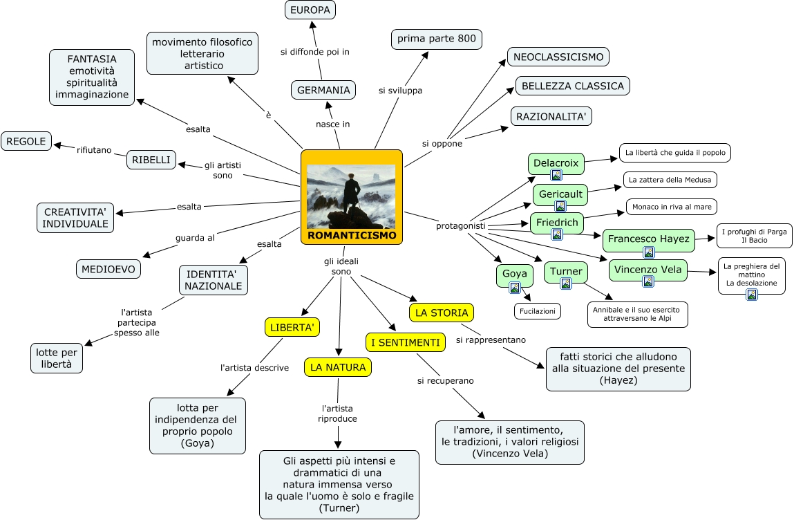 Questa Cmap, creata con IHMC CmapTools, contiene informazioni relative a: romanticismo, ROMANTICISMO nasce in GERMANIA, Francesco Hayez ???? I profughi di Parga Il Bacio, ROMANTICISMO protagonisti Vincenzo Vela, ROMANTICISMO protagonisti Delacroix, ROMANTICISMO protagonisti Goya, ROMANTICISMO gli ideali sono LIBERTA', Gericault ???? La zattera della Medusa, ROMANTICISMO protagonisti Francesco Hayez, Vincenzo Vela ???? La preghiera del mattino La desolazione, Friedrich ???? Monaco in riva al mare, ROMANTICISMO protagonisti Turner, ROMANTICISMO gli ideali sono I SENTIMENTI, I SENTIMENTI si recuperano l'amore, il sentimento, le tradizioni, i valori religiosi (Vincenzo Vela), ROMANTICISMO gli ideali sono LA NATURA, Goya ???? Fucilazioni, GERMANIA si diffonde poi in EUROPA, ROMANTICISMO guarda al MEDIOEVO, ROMANTICISMO si oppone BELLEZZA CLASSICA, ROMANTICISMO protagonisti Gericault, Turner ???? Annibale e il suo esercito attraversano le Alpi
