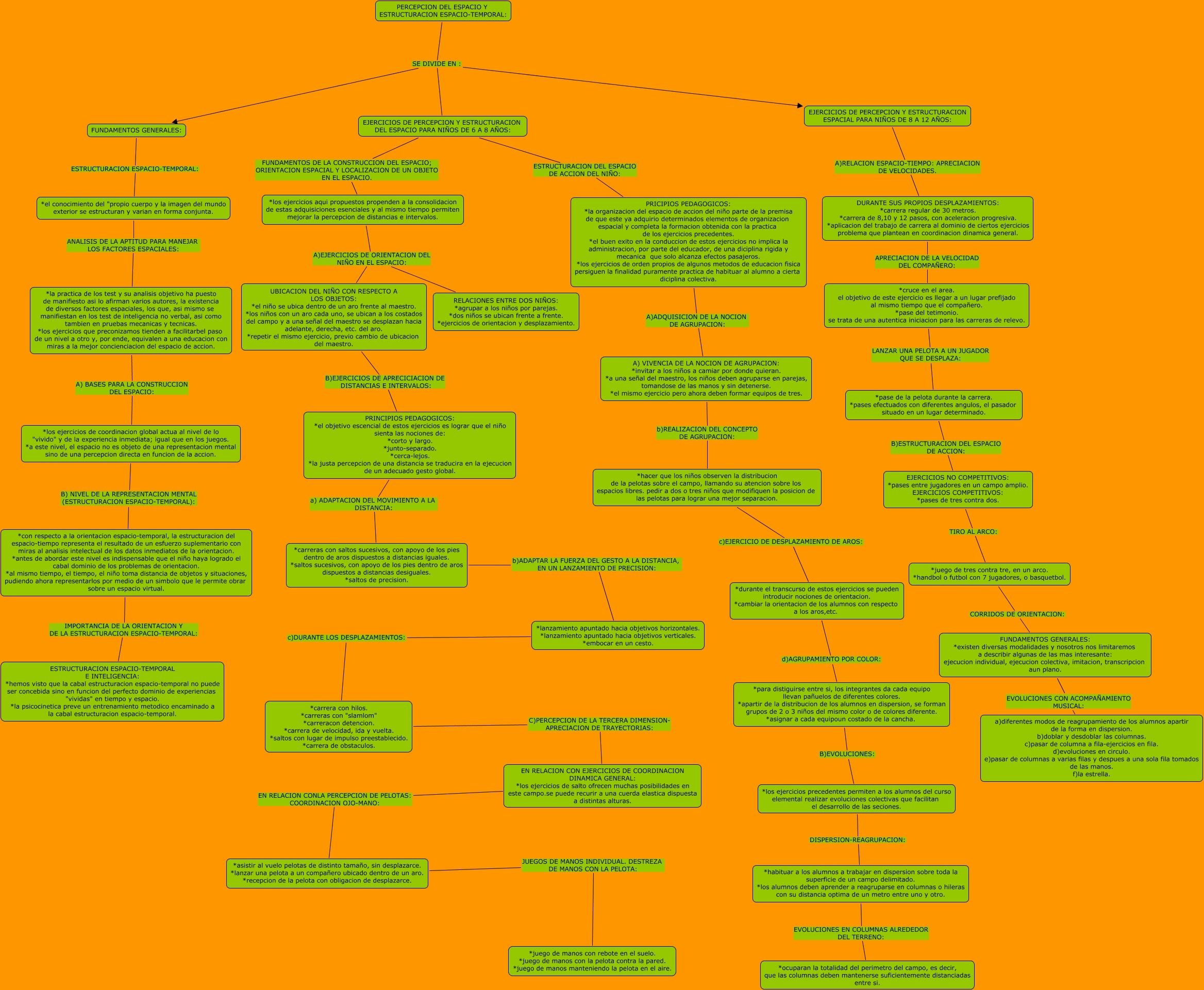 Este Cmap, tiene información relacionada con: 5.-PERCEPCION DEL ESPACIO Y ESTRUCTURACION ESPACIO-TEMPORAL, A) VIVENCIA DE LA NOCION DE AGRUPACION: *invitar a los niños a camiar por donde quieran. *a una señal del maestro, los niños deben agruparse en parejas, tomandose de las manos y sin detenerse. *el mismo ejercicio pero ahora deben formar equipos de tres. b)REALIZACION DEL CONCEPTO DE AGRUPACION: *hacer que los niños observen la distribucion de la pelotas sobre el campo, llamando su atencion sobre los espacios libres. pedir a dos o tres niños que modifiquen la posicion de las pelotas para lograr una mejor separacion., *para distiguirse entre si, los integrantes da cada equipo llevan pañuelos de diferentes colores. *apartir de la distribucion de los alumnos en dispersion, se forman grupos de 2 o 3 niños del mismo color o de colores diferente. *asignar a cada equipoun costado de la cancha. B)EVOLUCIONES: *los ejercicios precedentes permiten a los alumnos del curso elemental realizar evoluciones colectivas que facilitan el desarrollo de las seciones., FUNDAMENTOS GENERALES: ESTRUCTURACION ESPACIO-TEMPORAL: *el conocimiento del "propio cuerpo y la imagen del mundo exterior se estructuran y varian en forma conjunta., *la practica de los test y su analisis objetivo ha puesto de manifiesto asi lo afirman varios autores, la existencia de diversos factores espaciales, los que, asi mismo se manifiestan en los test de inteligencia no verbal, asi como tambien en pruebas mecanicas y tecnicas. *los ejercicios que preconizamos tienden a facilitarbel paso de un nivel a otro y, por ende, equivalen a una educacion con miras a la mejor concienciacion del espacio de accion. A) BASES PARA LA CONSTRUCCION DEL ESPACIO: *los ejercicios de coordinacion global actua al nivel de lo "vivido" y de la experiencia inmediata; igual que en los juegos. *a este nivel, el espacio no es objeto de una representacion mental sino de una percepcion directa en funcion de la accion., EJERCICIOS DE PERCEPCION Y ESTRUCTURACION DEL ESPACIO PARA NIÑOS DE 6 A 8 AÑOS: FUNDAMENTOS DE LA CONSTRUCCION DEL ESPACIO; ORIENTACION ESPACIAL Y LOCALIZACION DE UN OBJETO EN EL ESPACIO. *los ejercicios aqui propuestos propenden a la consolidacion de estas adquisiciones esenciales y al mismo tiempo permiten mejorar la percepcion de distancias e intervalos., *el conocimiento del "propio cuerpo y la imagen del mundo exterior se estructuran y varian en forma conjunta. ANALISIS DE LA APTITUD PARA MANEJAR LOS FACTORES ESPACIALES: *la practica de los test y su analisis objetivo ha puesto de manifiesto asi lo afirman varios autores, la existencia de diversos factores espaciales, los que, asi mismo se manifiestan en los test de inteligencia no verbal, asi como tambien en pruebas mecanicas y tecnicas. *los ejercicios que preconizamos tienden a facilitarbel paso de un nivel a otro y, por ende, equivalen a una educacion con miras a la mejor concienciacion del espacio de accion., EJERCICIOS DE PERCEPCION Y ESTRUCTURACION ESPACIAL PARA NIÑOS DE 8 A 12 AÑOS: A)RELACION ESPACIO-TIEMPO: APRECIACION DE VELOCIDADES. DURANTE SUS PROPIOS DESPLAZAMIENTOS: *carrera regular de 30 metros. *carrera de 8,10 y 12 pasos, con aceleracion progresiva. *aplicacion del trabajo de carrera al dominio de ciertos ejercicios problema que plantean en coordinacion dinamica general., UBICACION DEL NIÑO CON RESPECTO A LOS OBJETOS: *el niño se ubica dentro de un aro frente al maestro. *los niños con un aro cada uno, se ubican a los costados del campo y a una señal del maestro se desplazan hacia adelante, derecha, etc. del aro. *repetir el mismo ejercicio, previo cambio de ubicacion del maestro. B)EJERCICIOS DE APRECICIACION DE DISTANCIAS E INTERVALOS: PRINCIPIOS PEDAGOGICOS: *el objetivo escencial de estos ejercicios es lograr que el niño sienta las nociones de: *corto y largo. *junto-separado. *cerca-lejos. *la justa percepcion de una distancia se traducira en la ejecucion de un adecuado gesto global., *pase de la pelota durante la carrera. *pases efectuados con diferentes angulos, el pasador situado en un lugar determinado. B)ESTRUCTURACION DEL ESPACIO DE ACCION: EJERCICIOS NO COMPETITIVOS: *pases entre jugadores en un campo amplio. EJERCICIOS COMPETITIVOS: *pases de tres contra dos., DURANTE SUS PROPIOS DESPLAZAMIENTOS: *carrera regular de 30 metros. *carrera de 8,10 y 12 pasos, con aceleracion progresiva. *aplicacion del trabajo de carrera al dominio de ciertos ejercicios problema que plantean en coordinacion dinamica general. APRECIACION DE LA VELOCIDAD DEL COMPAÑERO: *cruce en el area. el objetivo de este ejercicio es llegar a un lugar prefijado al mismo tiempo que el compañero. *pase del tetimonio. se trata de una autentica iniciacion para las carreras de relevo., FUNDAMENTOS GENERALES: *existen diversas modalidades y nosotros nos limitaremos a describir algunas de las mas interesante: ejecucion individual, ejecucion colectiva, imitacion, transcripcion aun plano. EVOLUCIONES CON ACOMPAÑAMIENTO MUSICAL: a)diferentes modos de reagrupamiento de los alumnos apartir de la forma en dispersion. b)doblar y desdoblar las columnas. c)pasar de columna a fila-ejercicios en fila. d)evoluciones en circulo. e)pasar de columnas a varias filas y despues a una sola fila tomados de las manos. f)la estrella., PERCEPCION DEL ESPACIO Y ESTRUCTURACION ESPACIO-TEMPORAL: SE DIVIDE EN : FUNDAMENTOS GENERALES:, *los ejercicios precedentes permiten a los alumnos del curso elemental realizar evoluciones colectivas que facilitan el desarrollo de las seciones. DISPERSION-REAGRUPACION: *habituar a los alumnos a trabajar en dispersion sobre toda la superficie de un campo delimitado. *los alumnos deben aprender a reagruparse en columnas o hileras con su distancia optima de un metro entre uno y otro., PERCEPCION DEL ESPACIO Y ESTRUCTURACION ESPACIO-TEMPORAL: SE DIVIDE EN : EJERCICIOS DE PERCEPCION Y ESTRUCTURACION DEL ESPACIO PARA NIÑOS DE 6 A 8 AÑOS:, *durante el transcurso de estos ejercicios