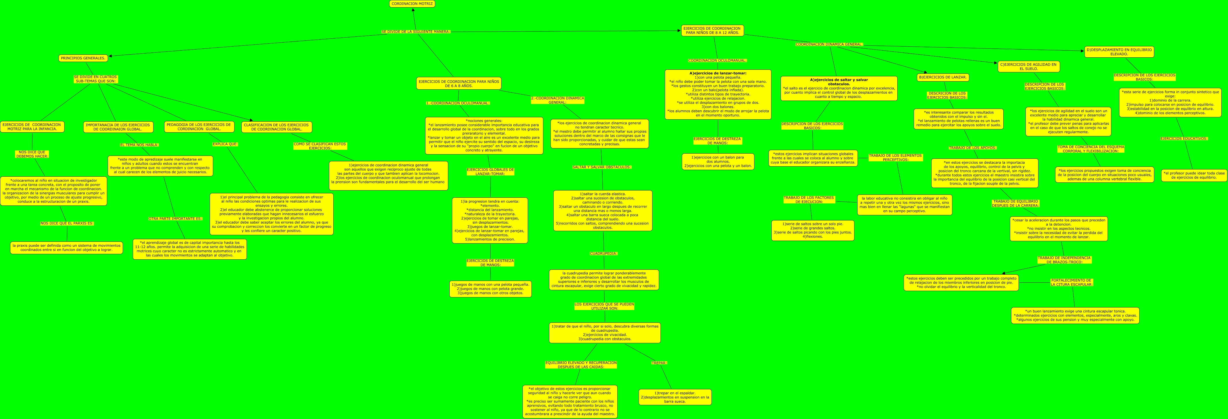 Este Cmap, tiene información relacionada con: 2 COORDINACION MOTRIZ, *nociones generales: *el lanzamiento posee considerable importancia educativa para el desarrollo global de la coordinacion, sobre todo en los grados preraratorio y elemental. *lanzar y tomar un objeto en el aire es un excelente medio para permitir que el niño ejercite su sentido del espacio, su destreza y la sensacion de su "propio cuerpo" en fucion de un objetivo concreto y atrayente. EJERCICIOS GLOBALES DE LANZAR-TOMAR: 1)la progresion tendra en cuenta: *elemento. *distancia del lanzamiento. *naturaleza de la trayectoria. 2)ejercicios de tomar en parejas, sin desplazamientos. 3)juegos de lanzar-tomar. 4)ejercicios de lanzar-tomar en parejas, con desplazamientos. 5)lanzamientos de precision., EJERCICIOS DE COORDINACION PARA NIÑOS DE 6 A 8 AÑOS. 1.-COORDINACION OCULOMANUAL: *nociones generales: *el lanzamiento posee considerable importancia educativa para el desarrollo global de la coordinacion, sobre todo en los grados preraratorio y elemental. *lanzar y tomar un objeto en el aire es un excelente medio para permitir que el niño ejercite su sentido del espacio, su destreza y la sensacion de su "propio cuerpo" en fucion de un objetivo concreto y atrayente., EJERCICIOS DE COORDINACION PARA NIÑOS DE 6 A 8 AÑOS. SE DIVIDE DE LA SIGUIENTE MANERA: PRINCIPIOS GENERALES., *estos ejercicios deben ser precedidos por un trabajo completo de relajacion de los miembros inferiores en posicion de pie. *no olvidar el equilibrio y la verticalidad del tronco. FORTALECIMIENTO DE LA CITURA ESCAPULAR: *un buen lanzamiento exige una cintura escapular tonica. *determinados ejercicios con elementos, especialmente, aros y clavas. *algunos ejercicios de sus pension y muy especialmente con apoyo., PRINCIPIOS GENERALES. SE DIVIDE EN CUATROS SUB-TEMAS QUE SON: EJERCICIOS DE COORDINACION MOTRIZ PARA LA INFANCIA., EJERCICIOS DE COORDINACION PARA NIÑOS DE 6 A 8 AÑOS. SE DIVIDE DE LA SIGUIENTE MANERA: CORDINACION MOTRIZ, EJERCICIOS DE COORDINACION PARA NIÑOS DE 6 A 8 AÑOS. SE DIVIDE DE LA SIGUIENTE MANERA: EJERCICIOS DE COORDINACION PARA NIÑOS DE 8 A 12 AÑOS., la cuadrupedia permite lograr ponderablemente grado de coordinacion global de las extremidades superiores e inferiores y desarrollar los musculos de cintura escapular, exige cierto grado de vivacidad y rapidez. LOS EJERCICIOS QUE SE PUEDEN UTILIZAR SON: 1)tratar de que el niño, por si solo, descubra diversas formas de cuadrupedia. 2)ejercicios de vivacidad. 3)cuadrupedia con obstaculos., EJERCICIOS DE COORDINACION PARA NIÑOS DE 8 A 12 AÑOS. COORDINACION DINAMICA GENERAL: A)ejercicios de saltar y salvar obstaculos. *el salto es el ejercicio de coordinacion dinamica por excelencia, por cuanto implica el control global de los desplazamientos en cuanto a tiempo y espacio., EJERCICIOS DE COORDINACION PARA NIÑOS DE 6 A 8 AÑOS. 2.-COORDINACION DINAMICA GENERAL: *los ejercicios de coordinacion dinamica general no tendran caracter tecnico. *el mestro debe permitir al alumno hallar sus propias soluciones dentro del marco de las consignas que le han sido proporcionadas, y cuidar de que estas sean concretadas y precisas., *es interesante comparar los resultados obtenidos con el impulso y sin el. *el lanzamiento de pelotas rellenas es un buen remedio para ejercitar los apoyos sobre el suelo. TRABAJO DE LOS APOYOS: *en estos ejercicios se destacara la importacia de los apoyos, equilibrio, control de la pelvis y posicion del tronco carcana de la vertival, sin rigidez. *durante todos estos ejercicios el maestro insistira sobre la importancia del equilibrio de la posicion casi vertical del tronco, de la fijacion souple de la pelvis., PRINCIPIOS GENERALES. SE DIVIDE EN CUATROS SUB-TEMAS QUE SON: CLASIFICACION DE LOS EJERCICIOS DE COORDINACION GLOBAL., B)EJERCICIOS DE LANZAR. DESCRICION DE LOS EJERCICIOS BASICOS: *es interesante comparar los resultados obtenidos con el impulso y sin el. *el lanzamiento de pelotas rellenas es un buen remedio para ejercitar los apoyos sobre el suelo., *colocaremos al niño en situacion de investigador frente a una tarea concreta, con el proposito de poner en marcha el mecanismo de la funcion de coordinacion. la organizacion de la sinergias musculares para cumplir un objetivo, por medio de un proceso de ajuste progresivo, conduce a la estructuracion de un praxis. NOS DICE QUE EL PARXIS ES: la praxis puede ser definida como un sistema de movimientos coordinados entre si en funcion del objetivo a lograr., 1)la progresion tendra en cuenta: *elemento. *distancia del lanzamiento. *naturaleza de la trayectoria. 2)ejercicios de tomar en parejas, sin desplazamientos. 3)juegos de lanzar-tomar. 4)ejercicios de lanzar-tomar en parejas, con desplazamientos. 5)lanzamientos de precision. EJERCICIOS DE DESTREZA DE MANOS: 1)juegos de manos con una pelota pequeña. 2)juegos de manos con pelota grande. 3)juegos de manos con otros objetos., CLASIFICACION DE LOS EJERCICIOS DE COORDINACION GLOBAL. COMO SE CLASIFICAN ESTOS EJERCICIOS: 1)ejercicios de coordinacion dinamica general son aquellos que exigen reciproco ajuste de todas las partes del cuerpo y que tambien aplican la locomocion. 2)los ejercicios de coordinacion oculomanual que prolongan la prension son fundamentales para el desarrollo del ser humano, IMPORTANACIA DE LOS EJERCICIOS DE COORDINAION GLOBAL. EL TEMA NOS HABLA: *este modo de apredizaje suele manifestarse en niños y adultos cuando estos se encuentran frente a un problema que no comprenden y con respecto al cual carecen de los elementos de juicio necesarios., *esta serie de ejercicios forma in conjunto sintetico que exige: 1)dominio de la carrera. 2)impulso para colocarse en posicion de equilibrio. 3)estabilidad en la posicion de equlibrio en altura. 4)dominio de los elementos perceptivos. EJERCICIOS EDUCATIVOS: *el profesor puede idear toda clase de ejercicios de equilibrio., *en estos ejercicios se destacara la importacia de los apoyos, equilibrio, control de la pelvis 