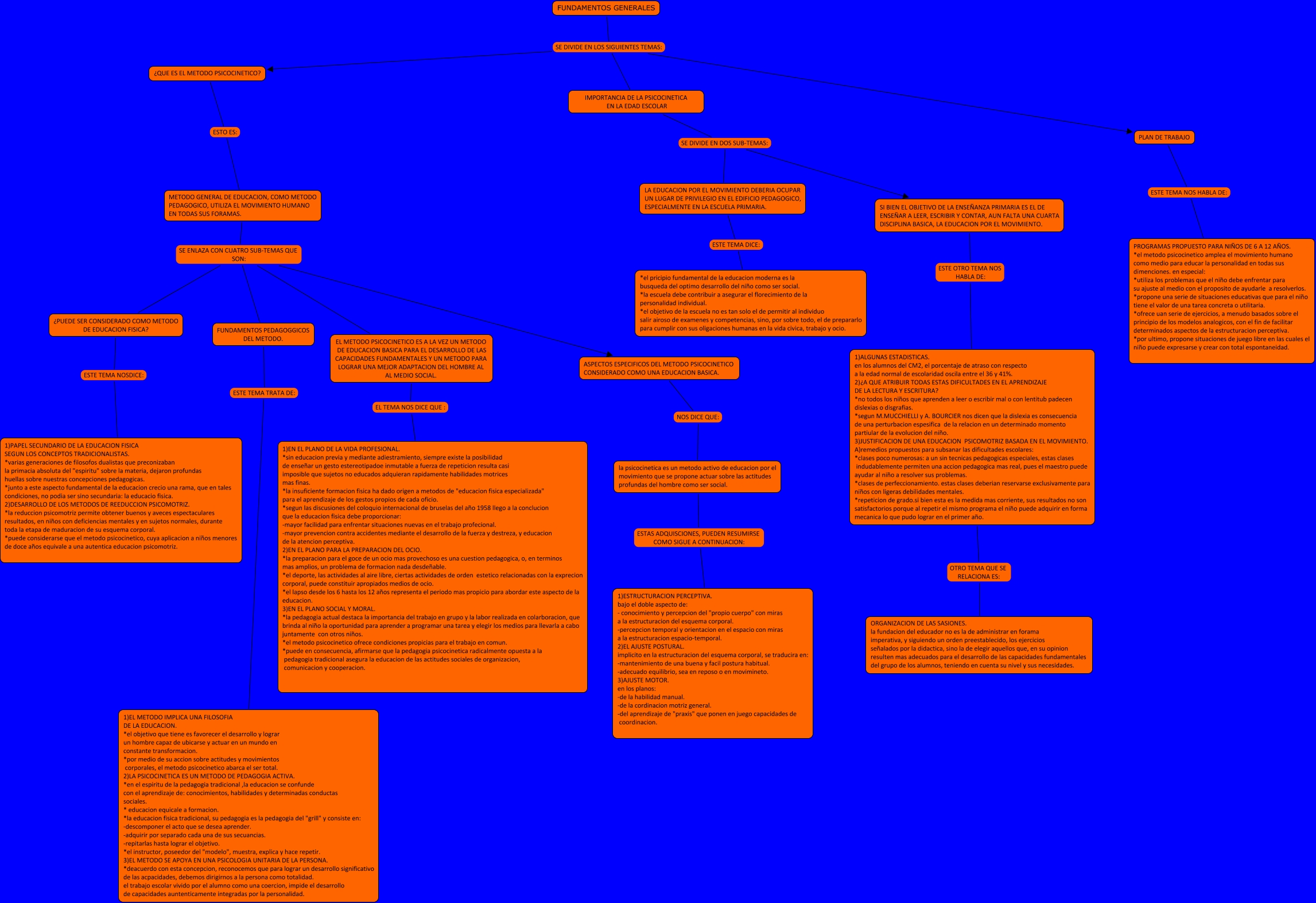 Este Cmap, tiene información relacionada con: 1.- FUNDAMENTOS GENERALES, SI BIEN EL OBJETIVO DE LA ENSEÑANZA PRIMARIA ES EL DE ENSEÑAR A LEER, ESCRIBIR Y CONTAR, AUN FALTA UNA CUARTA DISCIPLINA BASICA, LA EDUCACION POR EL MOVIMIENTO. ESTE OTRO TEMA NOS HABLA DE: 1)ALGUNAS ESTADISTICAS. en los alumnos del CM2, el porcentaje de atraso con respecto a la edad normal de escolaridad oscila entre el 36 y 41%. 2)¿A QUE ATRIBUIR TODAS ESTAS DIFICULTADES EN EL APRENDIZAJE DE LA LECTURA Y ESCRITURA? *no todos los niños que aprenden a leer o escribir mal o con lentitub padecen dislexias o disgrafias. *segun M.MUCCHIELLI y A. BOURCIER nos dicen que la dislexia es consecuencia de una perturbacion espesifica de la relacion en un determinado momento partiular de la evolucion del niño. 3)JUSTIFICACION DE UNA EDUCACION PSICOMOTRIZ BASADA EN EL MOVIMIENTO. A)remedios propuestos para subsanar las dificultades escolares: *clases poco numerosas: a un sin tecnicas pedagogicas especiales, estas clases indudablemente permiten una accion pedagogica mas real, pues el maestro puede ayudar al niño a resolver sus problemas. *clases de perfeccionamiento. estas clases deberian reservarse exclusivamente para niños con ligeras debilidades mentales. *repeticion de grado.si bien esta es la medida mas corriente, sus resultados no son satisfactorios porque al repetir el mismo programa el niño puede adquirir en forma mecanica lo que pudo lograr en el primer año., METODO GENERAL DE EDUCACION, COMO METODO PEDAGOGICO, UTILIZA EL MOVIMIENTO HUMANO EN TODAS SUS FORAMAS. SE ENLAZA CON CUATRO SUB-TEMAS QUE SON: EL METODO PSICOCINETICO ES A LA VEZ UN METODO DE EDUCACION BASICA PARA EL DESARROLLO DE LAS CAPACIDADES FUNDAMENTALES Y UN METODO PARA LOGRAR UNA MEJOR ADAPTACION DEL HOMBRE AL AL MEDIO SOCIAL., FUNDAMENTOS GENERALES SE DIVIDE EN LOS SIGUIENTES TEMAS: IMPORTANCIA DE LA PSICOCINETICA EN LA EDAD ESCOLAR, METODO GENERAL DE EDUCACION, COMO METODO PEDAGOGICO, UTILIZA EL MOVIMIENTO HUMANO EN TODAS SUS FORAMAS. SE ENLAZA CON CUATRO SUB-TEMAS QUE SON: FUNDAMENTOS PEDAGOGGICOS DEL METODO., IMPORTANCIA DE LA PSICOCINETICA EN LA EDAD ESCOLAR SE DIVIDE EN DOS SUB-TEMAS: LA EDUCACION POR EL MOVIMIENTO DEBERIA OCUPAR UN LUGAR DE PRIVILEGIO EN EL EDIFICIO PEDAGOGICO, ESPECIALMENTE EN LA ESCUELA PRIMARIA., FUNDAMENTOS PEDAGOGGICOS DEL METODO. ESTE TEMA TRATA DE: 1)EL METODO IMPLICA UNA FILOSOFIA DE LA EDUCACION. *el objetivo que tiene es favorecer el desarrollo y lograr un hombre capaz de ubicarse y actuar en un mundo en constante transformacion. *por medio de su accion sobre actitudes y movimientos corporales, el metodo psicocinetico abarca el ser total. 2)LA PSICOCINETICA ES UN METODO DE PEDAGOGIA ACTIVA. *en el espiritu de la pedagogia tradicional ,la educacion se confunde con el aprendizaje de: conocimientos, habilidades y determinadas conductas sociales. * educacion equicale a formacion. *la educacion fisica tradicional, su pedagogia es la pedagogia del "grill" y consiste en: -descomponer el acto que se desea aprender. -adquirir por separado cada una de sus secuancias. -repitarlas hasta lograr el objetivo. *el instructor, poseedor del "modelo", muestra, explica y hace repetir. 3)EL METODO SE APOYA EN UNA PSICOLOGIA UNITARIA DE LA PERSONA. *deacuerdo con esta concepcion, reconocemos que para lograr un desarrollo significativo de las acpacidades, debemos dirigirnos a la persona como totalidad. el trabajo escolar vivido por el alumno como una coercion, impide el desarrollo de capacidades auntenticamente integradas por la personalidad., EL METODO PSICOCINETICO ES A LA VEZ UN METODO DE EDUCACION BASICA PARA EL DESARROLLO DE LAS CAPACIDADES FUNDAMENTALES Y UN METODO PARA LOGRAR UNA MEJOR ADAPTACION DEL HOMBRE AL AL MEDIO SOCIAL. EL TEMA NOS DICE QUE : 1)EN EL PLANO DE LA VIDA PROFESIONAL. *sin educacion previa y mediante adiestramiento, siempre existe la posibilidad de enseñar un gesto estereotipadoe inmutable a fuerza de repeticion resulta casi imposible que sujetos no educados adquieran rapidamente habilidades motrices mas finas. *la insuficiente formacion fisica ha dado origen a metodos de "educacion fisica especializada" para el aprendizaje de los gestos propios de cada oficio. *segun las discusiones del coloquio internacional de bruselas del año 1958 llego a la conclucion que la educacion fisica debe proporcionar: -mayor facilidad para enfrentar situaciones nuevas en el trabajo profecional. -mayor prevencion contra accidentes mediante el desarrollo de la fuerza y destreza, y educacion de la atencion perceptiva. 2)EN EL PLANO PARA LA PREPARACION DEL OCIO. *la preparacion para el goce de un ocio mas provechoso es una cuestion pedagogica, o, en terminos mas amplios, un problema de formacion nada desdeñable. *el deporte, las actividades al aire libre, ciertas actividades de orden estetico relacionadas con la exprecion corporal, puede constituir apropiados medios de ocio. *el lapso desde los 6 hasta los 12 años representa el periodo mas propicio para abordar este aspecto de la educacion. 3)EN EL PLANO SOCIAL Y MORAL. *la pedagogia actual destaca la importancia del trabajo en grupo y la labor realizada en colarboracion, que brinda al niño la oportunidad para aprender a programar una tarea y elegir los medios para llevarla a cabo juntamente con otros niños. *el metodo psicocinetico ofrece condiciones propicias para el trabajo en comun. *puede en consecuencia, afirmarse que la pedagogia psicocinetica radicalmente opuesta a la pedagogia tradicional asegura la educacion de las actitudes sociales de organizacion, comunicacion y cooperacion., la psicocinetica es un metodo activo de educacion por el movimiento que se propone actuar sobre las actitudes profundas del hombre como ser social. ESTAS ADQUISCIONES, PUEDEN RESUMIRSE COMO SIGUE A CONTINUACION: 1)ESTRUCTURACION PERCEPTIVA. bajo el doble aspecto de: - conocimiento y percepcion del "propio cuerpo" con miras a la estructuracion del esquema corporal. -percepcion temporal y orientac