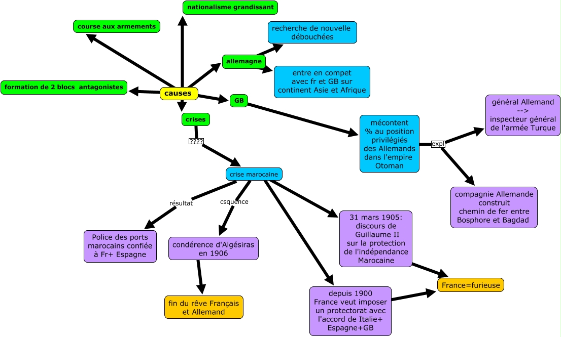 Cette carte de concepts créée avec IHMC CmapTools traite de: chapitre 1.2 causes, causes ???? crises, GB ???? mécontent % au position privilégiés des Allemands dans l'empire Otoman, 31 mars 1905: discours de Guillaume II sur la protection de l'indépendance Marocaine ???? France=furieuse, crise marocaine résultat Police des ports marocains confiée à Fr+ Espagne, crise marocaine csquence condérence d'Algésiras en 1906, causes ???? GB, depuis 1900 France veut imposer un protectorat avec l'accord de Italie+ Espagne+GB ???? France=furieuse, causes ???? allemagne, crise marocaine ???? depuis 1900 France veut imposer un protectorat avec l'accord de Italie+ Espagne+GB, crises ???? crise marocaine, allemagne ???? recherche de nouvelle débouchées, causes ???? course aux armements, causes ???? formation de 2 blocs antagonistes, crise marocaine ???? 31 mars 1905: discours de Guillaume II sur la protection de l'indépendance Marocaine, mécontent % au position privilégiés des Allemands dans l'empire Otoman expl général Allemand --> inspecteur général de l'armée Turque, allemagne ???? entre en compet avec fr et GB sur continent Asie et Afrique, causes ???? nationalisme grandissant, mécontent % au position privilégiés des Allemands dans l'empire Otoman expl compagnie Allemande construit chemin de fer entre Bosphore et Bagdad, condérence d'Algésiras en 1906 ???? fin du rêve Français et Allemand