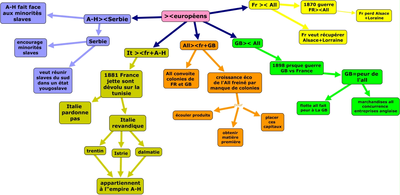 Cette carte de concepts créée avec IHMC CmapTools traite de: chapitre 1.1.2 antagonisme Européen, ><européens ???? A-H><Serbie, Fr >< All ???? Fr veut récupérer Alsace+Lorraine, ><européens ???? All><fr+GB, 1898 prsque guerre GB vs France ???? GB=peur de l'all, GB>< All ???? 1898 prsque guerre GB vs France, dalmatie ???? appartiennent à l"empire A-H, Italie revandique Istrie, croissance éco de l'All freiné par manque de colonies pour écouler produits, trentin ???? appartiennent à l"empire A-H, Italie revandique dalmatie, ><européens ???? GB>< All, 1881 France jette sont dévolu sur la tunisie ???? Italie pardonne pas, GB=peur de l'all ???? marchandises all concurrence entreprises anglaise, A-H><Serbie ???? A-H fait face aux minorités slaves, Italie revandique trentin, ><européens ???? Fr >< All, All><fr+GB ???? croissance éco de l'All freiné par manque de colonies, croissance éco de l'All freiné par manque de colonies pour obtenir matière première, Istrie ???? appartiennent à l"empire A-H, croissance éco de l'All freiné par manque de colonies pour placer ces capitaux