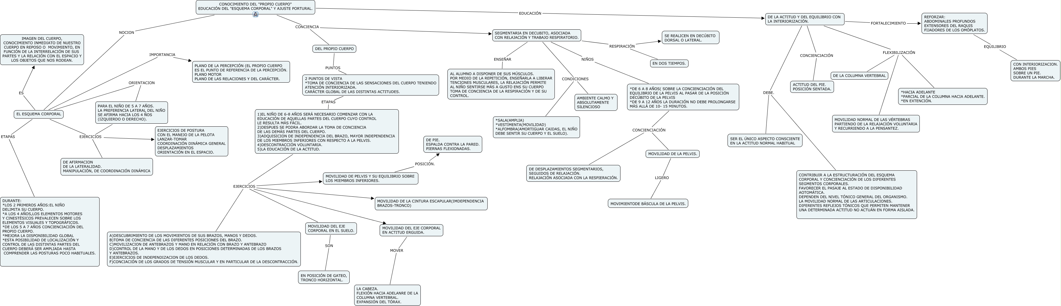 Este Cmap, tiene información relacionada con: TERCERA PARTE, DE LA ACTITUD Y DEL EQUILIBRIO CON LA INTERIORIZACIÓN. DEBE. SER EL ÚNICO ASPECTO CONSCIENTE EN LA ACTITUD NORMAL HABITUAL, SEGMENTARIA EN DECUBITO, ASOCIADA CON RELAJACIÓN Y TRABAJO RESPIRATORIO. ENSEÑAR AL ALUMNO A DISPONER DE SUS MÚSCULOS. POR MEDIO DE LA REPETICIÓN, ENSEÑARLA A LIBERAR TENCIONES MUSCULARES, LA RELAJACIÓN PERMITE AL NIÑO SENTIRSE MÁS A GUSTO ENS SU CUERPO TOMA DE CONCIENCIA DE LA RESPIRACIÓN Y DE SU CONTROL., SEGMENTARIA EN DECUBITO, ASOCIADA CON RELAJACIÓN Y TRABAJO RESPIRATORIO. CONDICIONES AMBIENTE CALMO Y ABSOLUTAMENTE SILENCIOSO, EL ESQUEMA CORPORAL ES IMAGEN DEL CUERPO, CONOCIMIENTO INMEDIATO DE NUESTRO CUERPO EN REPOSO O MOVIMIENTO, EN FUNCIÓN DE LA INTERRELACIÓN DE SUS PARTES Y LA RELACIÓN CON EL ESPACIO Y LOS OBJETOS QUE NOS RODEAN., DE LA ACTITUD Y DEL EQUILIBRIO CON LA INTERIORIZACIÓN. FLEXIBILIZACIÓN MOVILIDAD NORMAL DE LAS VÉRTEBRAS PARTIENDO DE LA RELAJACIÓN VOLUNTARIA Y RECURRIENDO A LA PENSANTEZ., 1)EL NIÑO DE 6-8 AÑOS SERÁ NECESARIO COMENZAR CON LA EDUCACIÓN DE AQUELLAS PARTES DEL CUERPO CUYO CONTROL LE RESULTA MÁS FÁCIL. 2)DESPUES SE PODRA ABORDAR LA TOMA DE CONCIENCIA DE LAS DEMÁS PARTES DEL CUERPO. 3)ADQUISICION DE INDEPENDENCIA DEL BRAZO, MAYOR INDEPENDENCIA DE LOS MIEMBROS INFERIORES CON RESPECTO A LA PELVIS. 4)DESCONTRACCIÓN VOLUNTARIA. 5)LA EDUCACIÓN DE LA ACTITUD. EJERCICIOS MOVILIDAD DE LA CINTURA ESCAPULAR(IMDEPENDENCIA BRAZOS-TRONCO), EL ESQUEMA CORPORAL ORIENTACION PARA EL NIÑO DE 5 A 7 AÑOS. LA PREFERENCIA LATERAL DEL NIÑO SE AFIRMA HACIA LOS 4 ÑOS (IZQUIERDO O DERECHO)., MOVILIDAD DEL EJE CORPORAL EN ACTITUD ERGUIDA. MOVER LA CABEZA. FLEXIÓN HACIA ADELANRE DE LA COLUMNA VERTEBRAL. EXPANSIÓN DEL TÓRAX., DE LA ACTITUD Y DEL EQUILIBRIO CON LA INTERIORIZACIÓN. DEBE. CONTRIBUIR A LA ESTRUCTURACIÓN DEL ESQUEMA CORPORAL Y CONCIENCIACIÓN DE LOS DIFERENTES SEGMENTOS CORPORALES. FAVORECER EL PASAJE AL ESTADO DE DISPONIBILIDAD AOTOMÁTICA. DEPENDEN DEL NIVEL TÓNICO GENERAL DEL ORGANISMO. LA MOVILIDAD NORMAL DE LAS ARTICULACIONES. DIFERENTES REFLEJOS TÓNICOS QUE PERMITEN MANTENER UNA DETERMINADA ACTITUD NO ACTUÁN EN FORMA AISLADA., EL ESQUEMA CORPORAL IMPORTANCIA PLANO DE LA PERCEPCIÓN (EL PROPIO CUERPO ES EL PUNTO DE REFERENCIA DE LA PERCEPCIÓN. PLANO MOTOR PLANO DE LAS RELACIONES Y DEL CARÁCTER., SEGMENTARIA EN DECUBITO, ASOCIADA CON RELAJACIÓN Y TRABAJO RESPIRATORIO. RESPIRACIÓN SE REALICEN EN DECÚBITO DORSAL O LATERAL., CONOCIMIENTO DEL "PROPIO CUERPO" EDUCACIÓN DEL "ESQUEMA CORPORAL" Y AJUSTE PORTURAL. CONCIENCIA DEL PROPIO CUERPO, PARA EL NIÑO DE 5 A 7 AÑOS. LA PREFERENCIA LATERAL DEL NIÑO SE AFIRMA HACIA LOS 4 ÑOS (IZQUIERDO O DERECHO). EJERCICIOS EJERCICIOS DE POSTURA CON EL MANEJO DE LA PELOTA LANZAR-TOMAR COORDINACIÓN DINÁMICA GENERAL DESPLAZAMIENTOS ORIENTACIÓN EN EL ESPACIO., CONOCIMIENTO DEL "PROPIO CUERPO" EDUCACIÓN DEL "ESQUEMA CORPORAL" Y AJUSTE PORTURAL. NOCION EL ESQUEMA CORPORAL, 2 PUNTOS DE VISTA *TOMA DE CONCIENCIA DE LAS SENSACIONES DEL CUERPO TENIENDO ATENCIÓN INTERIORIZADA. CARÁCTER GLOBAL DE LAS DISTINTAS ACTITUDES. ETAPAS 1)EL NIÑO DE 6-8 AÑOS SERÁ NECESARIO COMENZAR CON LA EDUCACIÓN DE AQUELLAS PARTES DEL CUERPO CUYO CONTROL LE RESULTA MÁS FÁCIL. 2)DESPUES SE PODRA ABORDAR LA TOMA DE CONCIENCIA DE LAS DEMÁS PARTES DEL CUERPO. 3)ADQUISICION DE INDEPENDENCIA DEL BRAZO, MAYOR INDEPENDENCIA DE LOS MIEMBROS INFERIORES CON RESPECTO A LA PELVIS. 4)DESCONTRACCIÓN VOLUNTARIA. 5)LA EDUCACIÓN DE LA ACTITUD., 1)EL NIÑO DE 6-8 AÑOS SERÁ NECESARIO COMENZAR CON LA EDUCACIÓN DE AQUELLAS PARTES DEL CUERPO CUYO CONTROL LE RESULTA MÁS FÁCIL. 2)DESPUES SE PODRA ABORDAR LA TOMA DE CONCIENCIA DE LAS DEMÁS PARTES DEL CUERPO. 3)ADQUISICION DE INDEPENDENCIA DEL BRAZO, MAYOR INDEPENDENCIA DE LOS MIEMBROS INFERIORES CON RESPECTO A LA PELVIS. 4)DESCONTRACCIÓN VOLUNTARIA. 5)LA EDUCACIÓN DE LA ACTITUD. EJERCICIOS A)DESCUBRIMIENTO DE LOS MOVIMIENTOS DE SUS BRAZOS, MANOS Y DEDOS. B)TOMA DE CONCIENCIA DE LAS DIFERENTES POSICIONES DEL BRAZO. C)MOVILIZACION DE ANTEBRAZOS Y MANO EN RELACIÓN CON BRAZO Y ANTEBRAZO D)CONTROL DE LA MANO Y DE LOS DEDOS EN POSICIONES DETERMINADAS DE LOS BRAZOS Y ANTEBRAZOS. E)EJERCICIOS DE INDEPENDIZACION DE LOS DEDOS. F)CONCIACIÓN DE LOS GRADOS DE TENSIÓN MUSCULAR Y EN PARTICULAR DE LA DESCONTRACCIÓN., PARA EL NIÑO DE 5 A 7 AÑOS. LA PREFERENCIA LATERAL DEL NIÑO SE AFIRMA HACIA LOS 4 ÑOS (IZQUIERDO O DERECHO). EJERCICIOS DE AFIRMACION DE LA LATERALIDAD. MANIPULACIÓN, DE COORDINACIÓN DINÁMICA, DE LA ACTITUD Y DEL EQUILIBRIO CON LA INTERIORIZACIÓN. CONCIENCIACIÓN ACTITUD DEL PIE. POSICIÓN SENTADA., *DE 6 A 8 AÑOS( SOBRE LA CONCIENCIACIÓN DEL EQUILIBRIO DE LA PELVIS AL PASAR DE LA POSICIÓN DECÚBITO DE LA PELVIS *DE 9 A 12 AÑOS LA DURACIÓN NO DEBE PROLONGARSE MÁS ALLÁ DE 10- 15 MINUTOS. CONCIENCIACIÓN DE DESPLAZAMIENTOS SEGMENTARIOS, SEGUIDOS DE RELAJACIÓN. RELAJACIÓN ASOCIADA CON LA RESPIERACIÓN., 1)EL NIÑO DE 6-8 AÑOS SERÁ NECESARIO COMENZAR CON LA EDUCACIÓN DE AQUELLAS PARTES DEL CUERPO CUYO CONTROL LE RESULTA MÁS FÁCIL. 2)DESPUES SE PODRA ABORDAR LA TOMA DE CONCIENCIA DE LAS DEMÁS PARTES DEL CUERPO. 3)ADQUISICION DE INDEPENDENCIA DEL BRAZO, MAYOR INDEPENDENCIA DE LOS MIEMBROS INFERIORES CON RESPECTO A LA PELVIS. 4)DESCONTRACCIÓN VOLUNTARIA. 5)LA EDUCACIÓN DE LA ACTITUD. EJERCICIOS MOVILIDAD DEL EJE CORPORAL EN ACTITUD ERGUIDA.