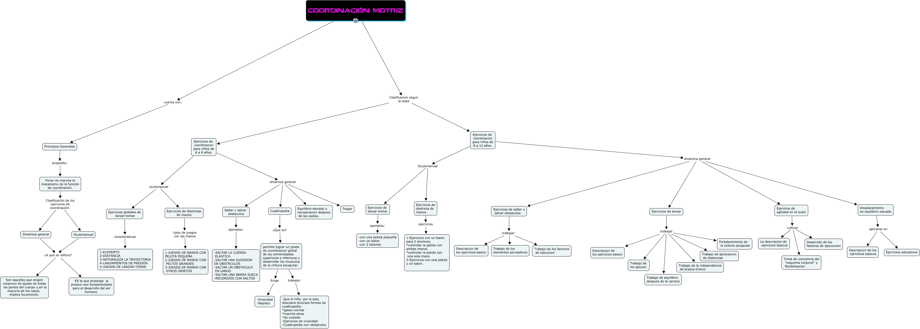 Este Cmap, tiene información relacionada con: PARTE 2, Ejercicios de lanzar trabajar Descripcion de los ejercicios basico, Ejercicios de lanzar trabajar Fortalecimiento de la cintura escapular, Ejercicios de coordinacion para niños de 8 a 12 años. Oculomanual Ejercicios de destreza de manos., Ejercicios de coordinacion para niños de 8 a 12 años. dinamica general Desplazamiento en equilibrio elevado, Ejercicos de agilidad en el suelo cultivar Toma de conciencia del "esquema corporal" y flexibilizacion, COORDINACIÓN MOTRIZ cuenta con: Principios Generales, Ejercicios de saltar y salvar obstaculos trabajar: Trabajo de los elementos perceptivos, Oculomanual ¿A qué se refiere? Son aquellos que exigen reciproco de ajuste de todas las partes del cuerpo y,en la mayoria de los casos, implica locomoción., Ejercicios de coordinacion para niños de 6 a 8 años. oculomanual Ejercicios globales de lanzar-tomar, Ejercicios de coordinacion para niños de 8 a 12 años. dinamica general Ejercicios de lanzar, Ejercicios de destrezas de manos tipos de juegos con las manos 1-JUEGOS DE MANOS CON PELOTA PEQUEÑA 2-JUEGOS DE MANOS CON PELTOS GRANDES 3-JUEGOS DE MANOS CON OTROS OBJETOS, Desplazamiento en equilibrio elevado aplicarse en Ejercicios educativos, COORDINACIÓN MOTRIZ Clasificacion segun la edad Ejercicios de coordinacion para niños de 8 a 12 años., COORDINACIÓN MOTRIZ Clasificacion segun la edad Ejercicios de coordinacion para niños de 6 a 8 años., Ejercicios de coordinacion para niños de 8 a 12 años. Oculomanual Ejercicios de lanzar-tomar, Ejercicios globales de lanzar-tomar caracteristicas 1-ELEMENTO 2-DISTANCIA 3-NATURALEZA LA TRAYECTORIA 4-LANZAMIENTOS DE PRESION 5-JUEGOS DE LANZAR-TOMAR, Ejercicios de coordinacion para niños de 6 a 8 años. dinamica general Saltar y salvar obstaculos, Ejercicios de saltar y salvar obstaculos trabajar: Descripcion de los ejercicios basico, Ejercicios de saltar y salvar obstaculos trabajar: Trabajo de los factores de ejecucion, Ejercicos de agilidad en el suelo cultivar La descripcion de ejercicios basicos