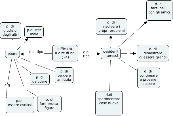 Questa Cmap, creata con IHMC CmapTools, contiene informazioni relative a: difficoltà a dire di no, desideri/ interessi d. di continuare a provare piacere, difficoltà a dire di no (2a) è di tipo paure, paure p. di fare brutta figura, desideri/ interessi d. di risolvere i propri problemi, paure p.di star male, desideri/ interessi d. di farsi belli con gli amici, paure p. di giudizio degli altri, difficoltà a dire di no (2a) è di tipo desideri/ interessi, desideri/ interessi d.di sperimentare cose nuove, paure p. di perdere amicizia, desideri/ interessi d. di dimostrare di essere grandi, paure e.g p.di essere esclusi, paure p. di deludere