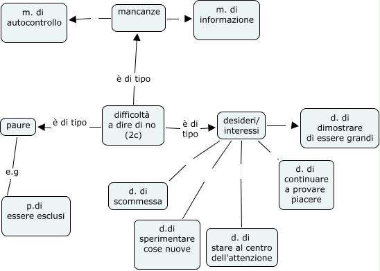 Questa Cmap, creata con IHMC CmapTools, contiene informazioni relative a: difficoltà a dire di no, difficoltà a dire di no (2c) è di tipo desideri/ interessi, desideri/ interessi d. di dimostrare di essere grandi, desideri/ interessi d.di sperimentare cose nuove, difficoltà a dire di no (2c) è di tipo paure, mancanze m. di autocontrollo, paure e.g p.di essere esclusi, difficoltà a dire di no (2c) è di tipo mancanze, mancanze m. di informazione, desideri/ interessi d. di continuare a provare piacere, desideri/ interessi d. di stare al centro dell'attenzione, desideri/ interessi d. di scommessa