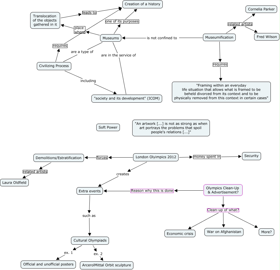 This Concept Map, created with IHMC CmapTools, has information related to: Museum & Olympics, Translocation of the objects gathered in it leads to Creation of a history, Museumification related artists Fred Wilson, Olympics Clean-Up & Advertisement? Reason why this is done Extra events, Museumification is not confined to Museums, London Olyimpics 2012 creates Extra events, Museums one of its purposes Creation of a history, Cultural Olympiads ex. 2 ArcerolMittal Orbit sculpture, Museums are in the service of "society and its development" (ICOM), Civilizing Process including "society and its development" (ICOM), Extra events such as Cultural Olympiads, Museums are a type of Civilizing Process, Civilizing Process requires Creation of a history, Cultural Olympiads ex. 1 Official and unofficial posters, Museums place where Translocation of the objects gathered in it, Olympics Clean-Up & Advertisement? Clean-up of what? More?, Olympics Clean-Up & Advertisement? Clean-up of what? War on Afghanistan, Museumification requires "Framing within an everyday life situation that allows what is framed to be beheld divorced from its context and to be physically removed from this context in certain cases", London Olyimpics 2012 money spent in Security, Museumification related artists Cornelia Parker, Olympics Clean-Up & Advertisement? Clean-up of what? Economic crisis