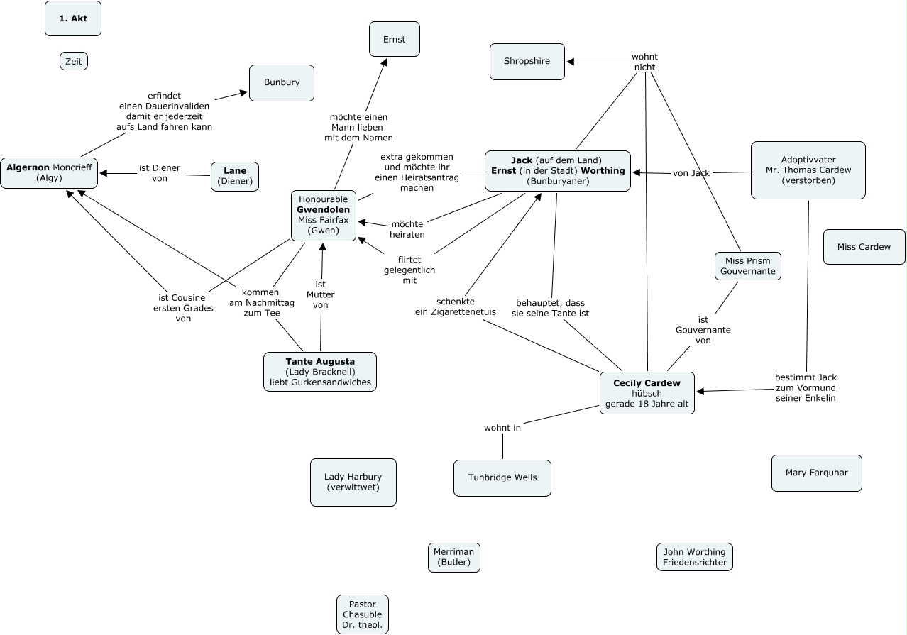 Dieses mit IHMC CmapTools erstellte CMap hat Informationen bezüglich: 1. Akt, Jack (auf dem Land) Ernst (in der Stadt) Worthing (Bunburyaner) behauptet, dass sie seine Tante ist Cecily Cardew hübsch gerade 18 Jahre alt, Miss Prism Gouvernante ist Gouvernante von Cecily Cardew hübsch gerade 18 Jahre alt, Lane (Diener) ist Diener von Algernon Moncrieff (Algy), Algernon Moncrieff (Algy) erfindet einen Dauerinvaliden damit er jederzeit aufs Land fahren kann Bunbury, Jack (auf dem Land) Ernst (in der Stadt) Worthing (Bunburyaner) extra gekommen und möchte ihr einen Heiratsantrag machen Honourable Gwendolen Miss Fairfax (Gwen), Honourable Gwendolen Miss Fairfax (Gwen) möchte einen Mann lieben mit dem Namen Ernst, Cecily Cardew hübsch gerade 18 Jahre alt wohnt nicht Shropshire, Honourable Gwendolen Miss Fairfax (Gwen) kommen am Nachmittag zum Tee Algernon Moncrieff (Algy), Cecily Cardew hübsch gerade 18 Jahre alt wohnt in Tunbridge Wells, Adoptivvater Mr. Thomas Cardew (verstorben) von Jack Jack (auf dem Land) Ernst (in der Stadt) Worthing (Bunburyaner), Miss Prism Gouvernante wohnt nicht Shropshire, Tante Augusta (Lady Bracknell) liebt Gurkensandwiches kommen am Nachmittag zum Tee Algernon Moncrieff (Algy), Honourable Gwendolen Miss Fairfax (Gwen) ist Cousine ersten Grades von Algernon Moncrieff (Algy), Cecily Cardew hübsch gerade 18 Jahre alt schenkte ein Zigarettenetuis Jack (auf dem Land) Ernst (in der Stadt) Worthing (Bunburyaner), Adoptivvater Mr. Thomas Cardew (verstorben) bestimmt Jack zum Vormund seiner Enkelin Cecily Cardew hübsch gerade 18 Jahre alt, Jack (auf dem Land) Ernst (in der Stadt) Worthing (Bunburyaner) wohnt nicht Shropshire, Jack (auf dem Land) Ernst (in der Stadt) Worthing (Bunburyaner) möchte heiraten Honourable Gwendolen Miss Fairfax (Gwen), Jack (auf dem Land) Ernst (in der Stadt) Worthing (Bunburyaner) flirtet gelegentlich mit Honourable Gwendolen Miss Fairfax (Gwen), Tante Augusta (Lady Bracknell) liebt Gurkensandwiches ist Mutter von Honourable Gwendolen Miss Fairfax (Gwen)
