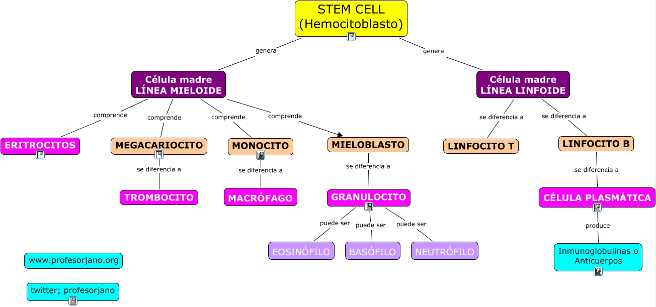 Este Cmap, tiene información relacionada con: HEMATOPOYESIS, Célula madre LÍNEA LINFOIDE se diferencia a LINFOCITO B, MEGACARIOCITO se diferencia a TROMBOCITO, MIELOBLASTO se diferencia a GRANULOCITO, GRANULOCITO puede ser BASÓFILO, CÉLULA PLASMÁTICA produce Inmunoglobulinas o Anticuerpos, LINFOCITO B se diferencia a CÉLULA PLASMÁTICA, STEM CELL (Hemocitoblasto) genera Célula madre LÍNEA LINFOIDE, Célula madre LÍNEA MIELOIDE comprende MIELOBLASTO, Célula madre LÍNEA MIELOIDE comprende ERITROCITOS, Célula madre LÍNEA MIELOIDE comprende MEGACARIOCITO, Célula madre LÍNEA LINFOIDE se diferencia a LINFOCITO T, STEM CELL (Hemocitoblasto) genera Célula madre LÍNEA MIELOIDE, Célula madre LÍNEA MIELOIDE comprende MONOCITO, GRANULOCITO puede ser EOSINÓFILO, GRANULOCITO puede ser NEUTRÓFILO, MONOCITO se diferencia a MACRÓFAGO