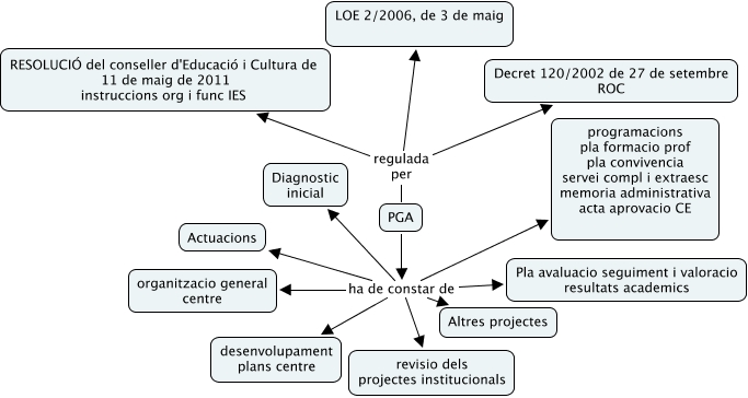 Aquest mapa conceptual conté informació relacionada amb: PGA, PGA ha de constar de Actuacions, PGA ha de constar de revisio dels projectes institucionals, PGA regulada per RESOLUCIÓ del conseller d'Educació i Cultura de 11 de maig de 2011 instruccions org i func IES, PGA ha de constar de Diagnostic inicial, PGA regulada per LOE 2/2006, de 3 de maig, PGA ha de constar de Altres projectes, PGA ha de constar de organitzacio general centre, PGA regulada per Decret 120/2002 de 27 de setembre ROC, PGA ha de constar de Pla avaluacio seguiment i valoracio resultats academics, PGA ha de constar de programacions pla formacio prof pla convivencia servei compl i extraesc memoria administrativa acta aprovacio CE, PGA ha de constar de desenvolupament plans centre