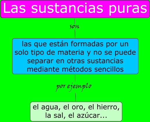 Este Cmap, tiene información relacionada con: Las sustancias puras, las que están formadas por un solo tipo de materia y no se puede separar en otras sustancias mediante métodos sencillos por ejemplo el agua, el oro, el hierro, la sal, el azúcar..., Las sustancias puras son las que están formadas por un solo tipo de materia y no se puede separar en otras sustancias mediante métodos sencillos