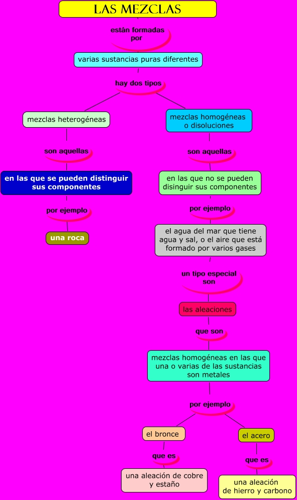 Este Cmap, tiene información relacionada con: Las mezclas, el bronce que es una aleación de cobre y estaño, las aleaciones que son mezclas homogéneas en las que una o varias de las sustancias son metales, mezclas homogéneas o disoluciones son aquellas en las que no se pueden disinguir sus componentes, mezclas homogéneas en las que una o varias de las sustancias son metales por ejemplo el bronce, varias sustancias puras diferentes hay dos tipos mezclas heterogéneas, mezclas heterogéneas son aquellas en las que se pueden distinguir sus componentes, el acero que es una aleación de hierro y carbono, mezclas homogéneas en las que una o varias de las sustancias son metales por ejemplo el acero, el agua del mar que tiene agua y sal, o el aire que está formado por varios gases un tipo especial son las aleaciones, en las que se pueden distinguir sus componentes por ejemplo una roca, Las mezclas están formadas por varias sustancias puras diferentes, varias sustancias puras diferentes hay dos tipos mezclas homogéneas o disoluciones, en las que no se pueden disinguir sus componentes por ejemplo el agua del mar que tiene agua y sal, o el aire que está formado por varios gases