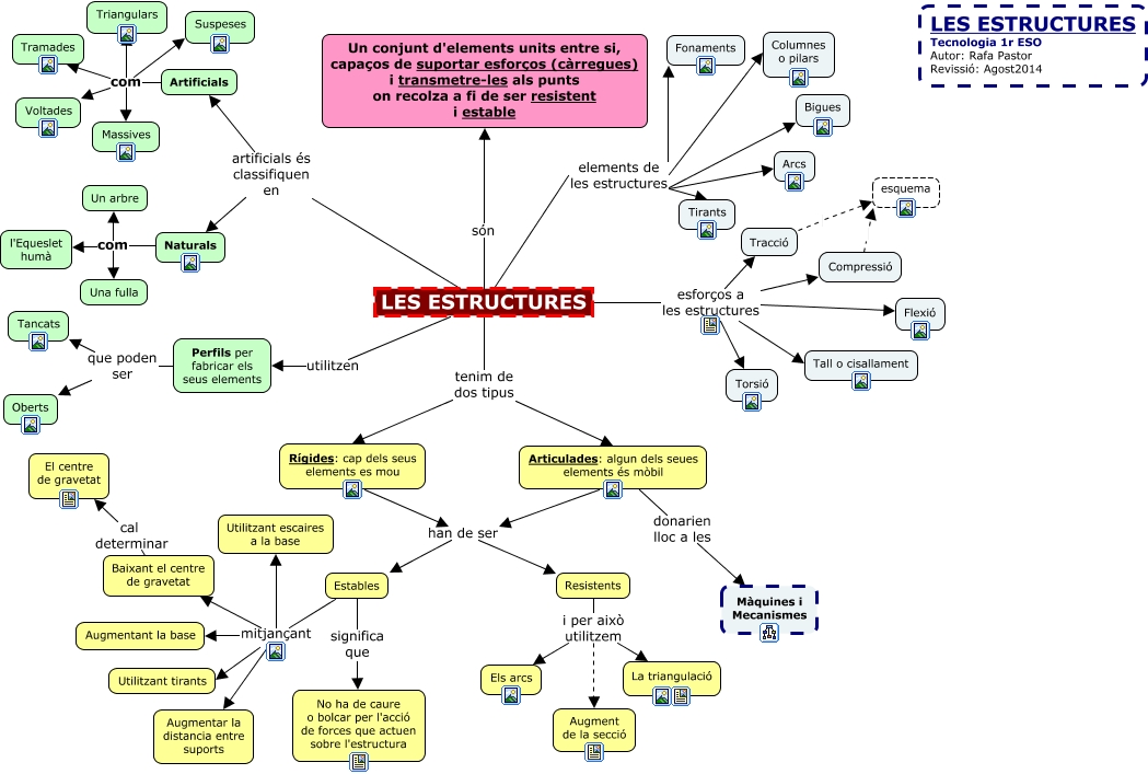 Este Cmap, tiene información relacionada con: Les estructures, LES ESTRUCTURES tenim de dos tipus Articulades: algun dels seues elements és mòbil, Estables mitjançant Augmentar la distancia entre suports, LES ESTRUCTURES esforços a les estructures Flexió, Compressió esquema, Perfils per fabricar els seus elements que poden ser Tancats, Naturals com l'Equeslet humà, LES ESTRUCTURES esforços a les estructures Torsió, Rígides: cap dels seus elements es mou han de ser Resistents, Naturals com Un arbre, Estables mitjançant Utilitzant escaires a la base, Artificials com Suspeses, Articulades: algun dels seues elements és mòbil han de ser Estables, LES ESTRUCTURES elements de les estructures Fonaments, LES ESTRUCTURES utilitzen Perfils per fabricar els seus elements, Articulades: algun dels seues elements és mòbil donarien lloc a les Màquines i Mecanismes, Artificials com Tramades, Estables mitjançant Utilitzant tirants, LES ESTRUCTURES són Un conjunt d'elements units entre si, capaços de suportar esforços (càrregues) i transmetre-les als punts on recolza a fi de ser resistent i estable, Rígides: cap dels seus elements es mou han de ser Estables, LES ESTRUCTURES elements de les estructures Bigues