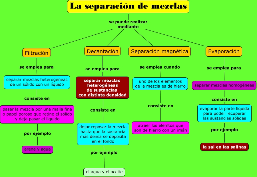 Este Cmap, tiene información relacionada con: La separación de mezclas, Decantación se emplea para separar mezclas heterogéneas de sustancias con distinta densidad, Separación magnética se emplea cuando uno de los elementos de la mezcla es de hierro, La separación de mezclas se puede realizar mediante Filtración, uno de los elementos de la mezcla es de hierro consiste en atraer los elemtos que son de hierro con un imán, La separación de mezclas se puede realizar mediante Decantación, La separación de mezclas se puede realizar mediante Separación magnética, dejar reposar la mezcla hasta que la sustancia más densa se deposita en el fondo por ejemplo el agua y el aceite, separar mezclas heterogéneas de sustancias con distinta densidad consiste en dejar reposar la mezcla hasta que la sustancia más densa se deposita en el fondo, pasar la mezcla por una malla fina o papel poroso que retine el sólido y deja pasar el líquido por ejemplo arena y agua, Evaporación se emplea para separar mezclas homogéneas, La separación de mezclas se puede realizar mediante Evaporación, evaporar la parte líquida para poder recuperar las sustancias sólidas por ejemplo la sal en las salinas, separar mezclas heterogéneas de un sólido con un líquido consiste en pasar la mezcla por una malla fina o papel poroso que retine el sólido y deja pasar el líquido, Filtración se emplea para separar mezclas heterogéneas de un sólido con un líquido, separar mezclas homogéneas consiste en evaporar la parte líquida para poder recuperar las sustancias sólidas