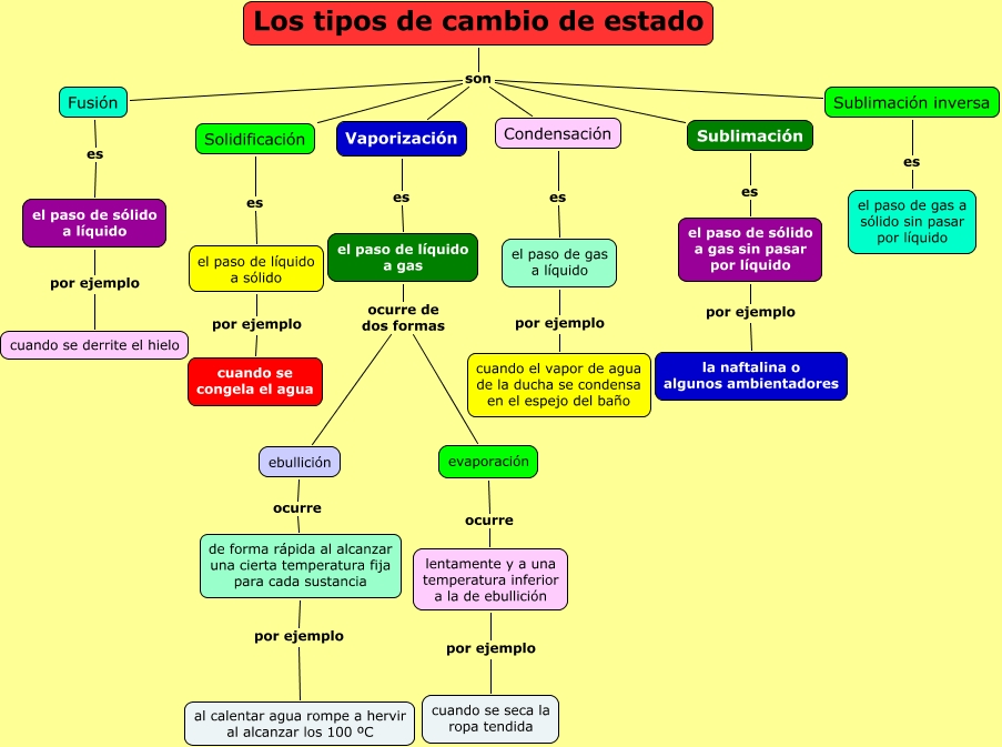 Este Cmap, tiene información relacionada con: Los cambios de estado, el paso de sólido a líquido por ejemplo cuando se derrite el hielo, Fusión es el paso de sólido a líquido, el paso de sólido a gas sin pasar por líquido por ejemplo la naftalina o algunos ambientadores, ebullición ocurre de forma rápida al alcanzar una cierta temperatura fija para cada sustancia, Los tipos de cambio de estado son Fusión, Los tipos de cambio de estado son Condensación, lentamente y a una temperatura inferior a la de ebullición por ejemplo cuando se seca la ropa tendida, el paso de líquido a gas ocurre de dos formas ebullición, Los tipos de cambio de estado son Vaporización, evaporación ocurre lentamente y a una temperatura inferior a la de ebullición, Sublimación es el paso de sólido a gas sin pasar por líquido, de forma rápida al alcanzar una cierta temperatura fija para cada sustancia por ejemplo al calentar agua rompe a hervir al alcanzar los 100 ºC, el paso de líquido a gas ocurre de dos formas evaporación, Solidificación es el paso de líquido a sólido, Los tipos de cambio de estado son Sublimación, Sublimación inversa es el paso de gas a sólido sin pasar por líquido, Los tipos de cambio de estado son Sublimación inversa, Los tipos de cambio de estado son Solidificación, Condensación es el paso de gas a líquido, el paso de gas a líquido por ejemplo cuando el vapor de agua de la ducha se condensa en el espejo del baño