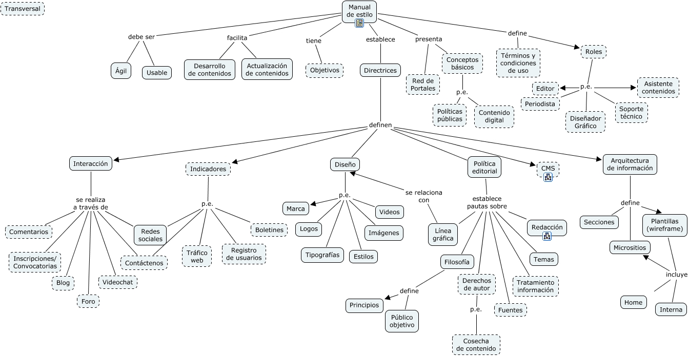 Este Cmap, tiene información relacionada con: Manual de estilo, Arquitectura de información define Plantillas (wireframe), Indicadores p.e. Tráfico web, Interacción se realiza a través de Contáctenos, Indicadores p.e. Contáctenos, Manual de estilo debe ser Usable, Manual de estilo define Roles, Indicadores p.e. Boletines, Roles p.e. Asistente contenidos, Plantillas (wireframe) incluye Interna, Diseño p.e. Tipografías, Política editorial establece pautas sobre Filosofía, Política editorial establece pautas sobre Redacción, Filosofía define Público objetivo, Arquitectura de información define Secciones, Conceptos básicos p.e. Contenido digital, Indicadores p.e. Redes sociales, Plantillas (wireframe) incluye Micrositios, Manual de estilo facilita Actualización de contenidos, Directrices definen CMS, Línea gráfica se relaciona con Diseño