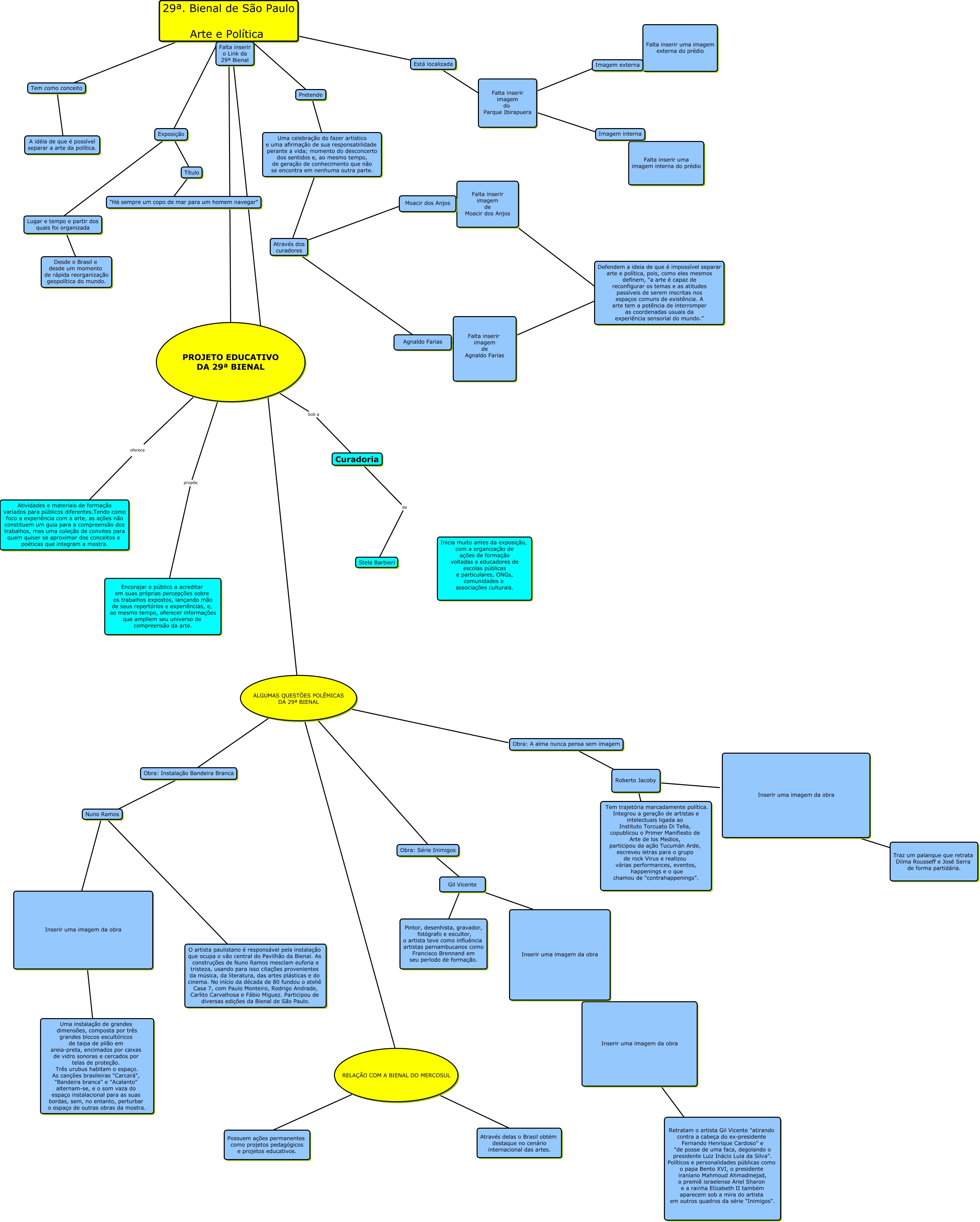 Esse mapa conceitual, produzido no IHMC CmapTools, tem a informação relacionada a: 29ª Bienal, Agnaldo Farias ???? Falta inserir imagem de Agnaldo Farias, Exposição ???? Lugar e tempo e partir dos quais foi organizada, Exposição ???? Título, RELAÇÃO COM A BIENAL DO MERCOSUL ???? Através delas o Brasil obtém destaque no cenário internacional das artes., Gil Vicente ???? Inserir uma imagem da obra, Gil Vicente ???? Pintor, desenhista, gravador, fotógrafo e escultor, o artista teve como influência artistas pernambucanos como Francisco Brennand em seu período de formação., Inserir uma imagem da obra ???? Uma instalação de grandes dimensões, composta por três grandes blocos escultóricos de taipa de pilão em areia-preta, encimados por caixas de vidro sonoras e cercados por telas de proteção. Três urubus habitam o espaço. As canções brasileiras "Carcará", "Bandeira branca" e "Acalanto" alternam-se, e o som vaza do espaço instalacional para as suas bordas, sem, no entanto, perturbar o espaço de outras obras da mostra., Falta inserir imagem de Agnaldo Farias ???? Defendem a ideia de que é impossível separar arte e política, pois, como eles mesmos definem, “a arte é capaz de reconfigurar os temas e as atitudes passíveis de serem inscritas nos espaços comuns de existência. A arte tem a potência de interromper as coordenadas usuais da experiência sensorial do mundo.”, ALGUMAS QUESTÕES POLÊMICAS DA 29ª BIENAL ???? Obra: Série Inimigos, Inserir uma imagem da obra ???? Inserir uma imagem da obra, Título ???? "Há sempre um copo de mar para um homem navegar", PROJETO EDUCATIVO DA 29ª BIENAL propõe Encorajar o público a acreditar em suas próprias percepções sobre os trabalhos expostos, lançando mão de seus repertórios e experiências, e, ao mesmo tempo, oferecer informações que ampliem seu universo de compreensão da arte., 29ª. Bienal de São Paulo Arte e Política ???? PROJETO EDUCATIVO DA 29ª BIENAL, 29ª. Bienal de São Paulo Arte e Política ???? Falta inserir o Link da 29ª Bienal, Imagem interna ???? Falta inserir uma imagem interna do prédio, Roberto Jacoby ???? Inserir uma imagem da obra, PROJETO EDUCATIVO DA 29ª BIENAL Sob a Curadoria, RELAÇÃO COM A BIENAL DO MERCOSUL ???? Possuem ações permanentes como projetos pedagógicos e projetos educativos., Nuno Ramos ???? O artista paulistano é responsável pela instalação que ocupa o vão central do Pavilhão da Bienal. As construções de Nuno Ramos mesclam euforia e tristeza, usando para isso citações provenientes da música, da literatura, das artes plásticas e do cinema. No início da década de 80 fundou o ateliê Casa 7, com Paulo Monteiro, Rodrigo Andrade, Carlito Carvalhosa e Fábio Miguez. Participou de diversas edições da Bienal de São Paulo., Imagem externa ???? Falta inserir uma imagem externa do prédio