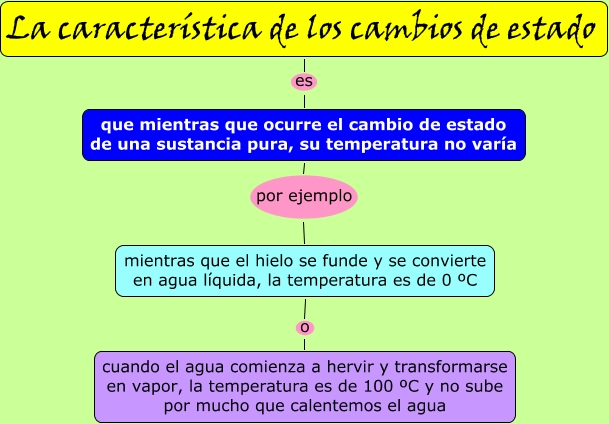 Este Cmap, tiene información relacionada con: La características de los cambios de estado, La característica de los cambios de estado es que mientras que ocurre el cambio de estado de una sustancia pura, su temperatura no varía, que mientras que ocurre el cambio de estado de una sustancia pura, su temperatura no varía por ejemplo mientras que el hielo se funde y se convierte en agua líquida, la temperatura es de 0 ºC, mientras que el hielo se funde y se convierte en agua líquida, la temperatura es de 0 ºC o cuando el agua comienza a hervir y transformarse en vapor, la temperatura es de 100 ºC y no sube por mucho que calentemos el agua