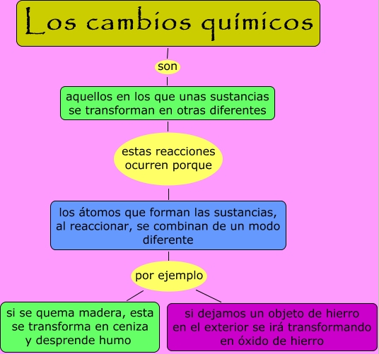 Este Cmap, tiene información relacionada con: Los cambios químicos, los átomos que forman las sustancias, al reaccionar, se combinan de un modo diferente por ejemplo si se quema madera, esta se transforma en ceniza y desprende humo, Los cambios químicos son aquellos en los que unas sustancias se transforman en otras diferentes, aquellos en los que unas sustancias se transforman en otras diferentes estas reacciones ocurren porque los átomos que forman las sustancias, al reaccionar, se combinan de un modo diferente, los átomos que forman las sustancias, al reaccionar, se combinan de un modo diferente por ejemplo si dejamos un objeto de hierro en el exterior se irá transformando en óxido de hierro