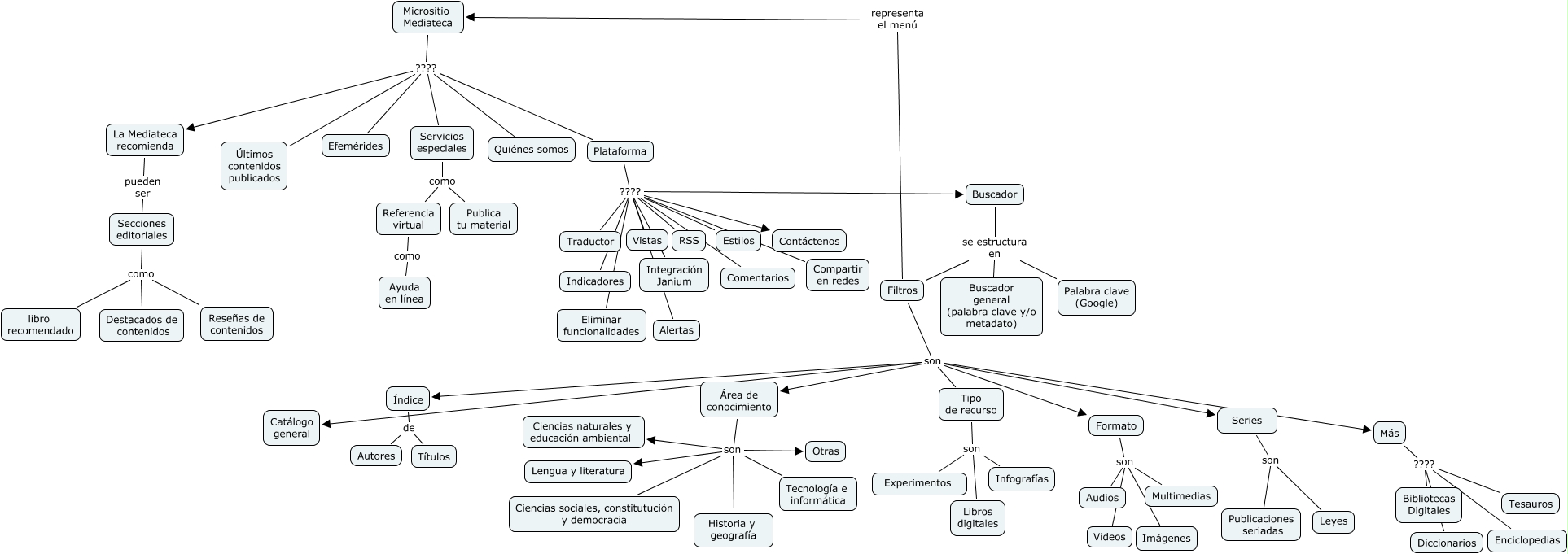 Este Cmap, tiene información relacionada con: Mediateca-Gestion Micrositio, Plataforma ???? Comentarios, Formato son Imágenes, Referencia virtual como Ayuda en línea, La Mediateca recomienda pueden ser Secciones editoriales, Plataforma ???? Compartir en redes, Plataforma ???? Estilos, Micrositio Mediateca ???? Plataforma, Plataforma ???? Traductor, Filtros son Series, Filtros representa el menú Micrositio Mediateca, Área de conocimiento son Tecnología e informática, Tipo de recurso son Experimentos, Buscador se estructura en Palabra clave (Google), Formato son Videos, Índice de Autores, Tipo de recurso son Infografías, Formato son Audios, Filtros son Tipo de recurso, Área de conocimiento son Lengua y literatura, Micrositio Mediateca ???? Efemérides