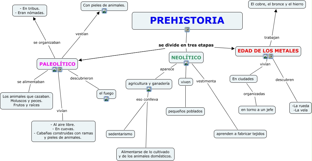 Este Cmap, tiene información relacionada con: LA PREHISTORIA 2, agricultura y ganadería eso conlleva Alimentarse de lo cultivado y de los animales domésticos., NEOLÍTICO vestimenta aprenden a fabricar tejidos, PREHISTORIA se divide en tres etapas NEOLÍTICO, PALEOLÍTICO vivían - Al aire libre. - En cuevas. - Cabañas construidas con ramas y pieles de animales., PALEOLÍTICO vestían Con pieles de animales., PREHISTORIA se divide en tres etapas EDAD DE LOS METALES, agricultura y ganadería eso conlleva sedentarismo, PALEOLÍTICO se divide en tres etapas EDAD DE LOS METALES, PALEOLÍTICO se divide en tres etapas NEOLÍTICO, EDAD DE LOS METALES vivían En ciudades, PALEOLÍTICO se alimentaban Los animales que cazaban. Moluscos y peces. Frutos y raíces, PALEOLÍTICO se organizaban - En tribus. - Eran nómadas., PALEOLÍTICO descubrieron el fuego, NEOLÍTICO ???? pequeños poblados, NEOLÍTICO aparece agricultura y ganadería, En ciudades organizadas en torno a un jefe, PREHISTORIA se divide en tres etapas PALEOLÍTICO, EDAD DE LOS METALES trabajan El cobre, el bronce y el hierro, EDAD DE LOS METALES descubren -La rueda -La vela