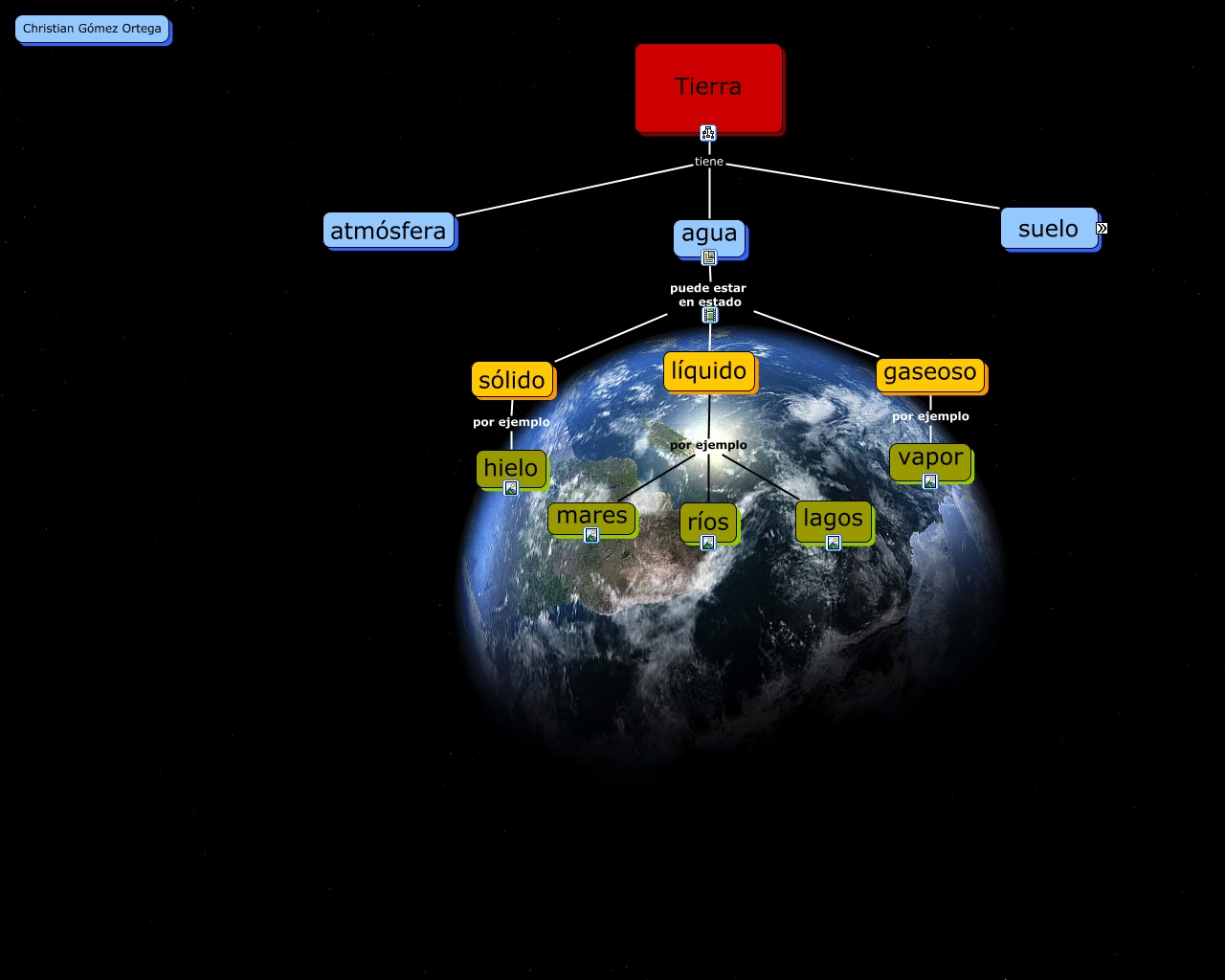 Este Cmap, tiene información relacionada con: Esto es la Tierra, Tierra tiene agua, gaseoso por ejemplo vapor, líquido por ejemplo ríos, agua puede estar en estado gaseoso, sólido por ejemplo hielo, Tierra tiene suelo, líquido por ejemplo lagos, líquido por ejemplo mares, agua puede estar en estado sólido, Tierra tiene atmósfera, agua puede estar en estado líquido