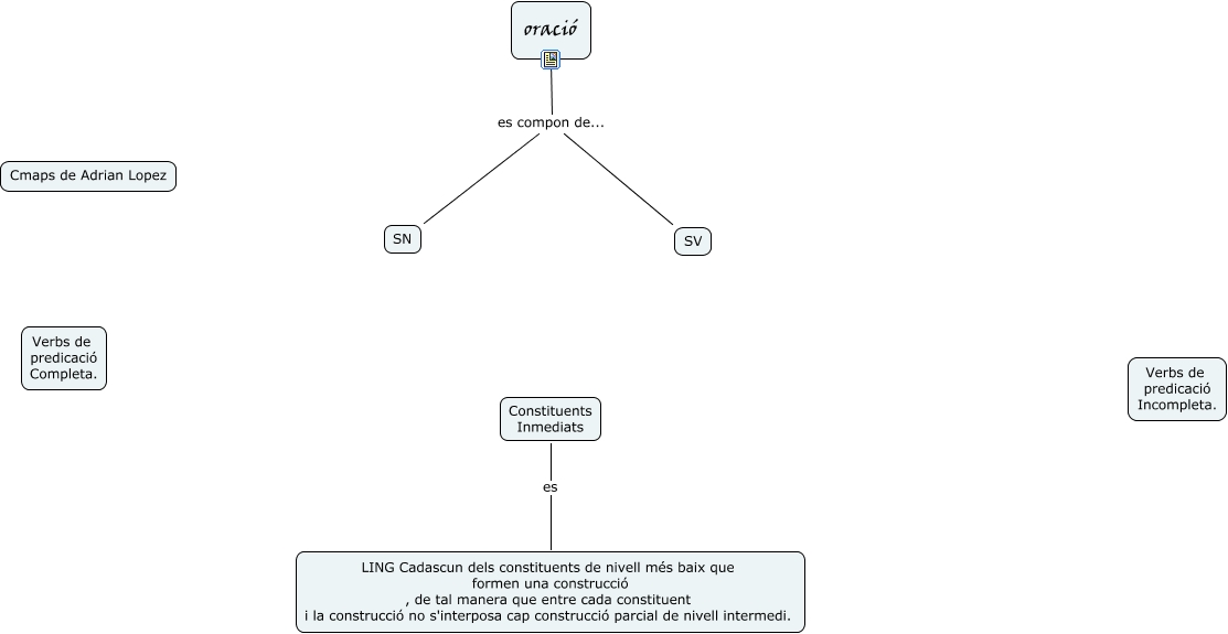 This Concept Map, created with IHMC CmapTools, has information related to: Sintaxis!!, oració es compon de... SV, Constituents Inmediats es LING Cadascun dels constituents de nivell més baix que formen una construcció , de tal manera que entre cada constituent i la construcció no s'interposa cap construcció parcial de nivell intermedi., oració es compon de... SN