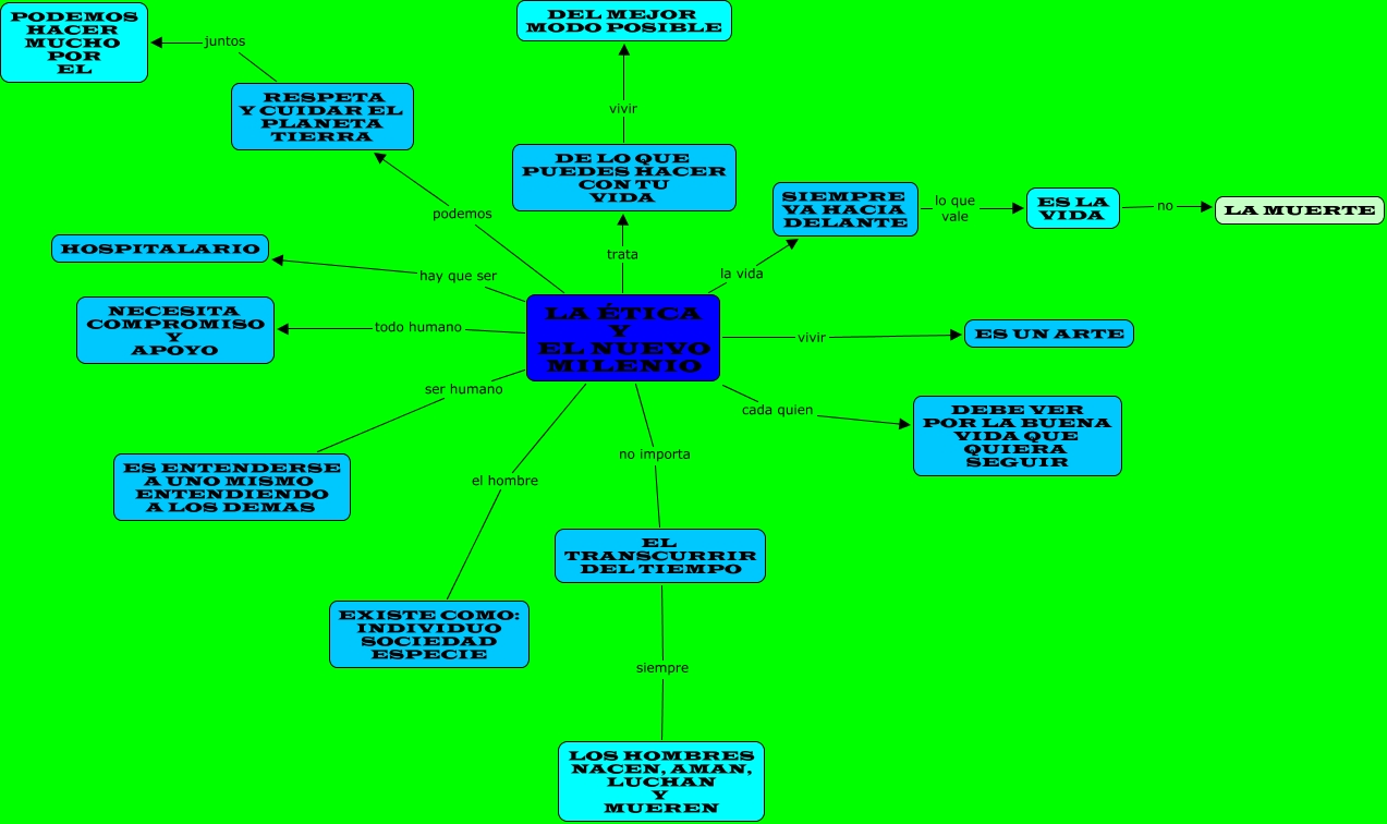 Este Cmap, tiene información relacionada con: EA 10, LA ÉTICA Y EL NUEVO MILENIO todo humano NECESITA COMPROMISO Y APOYO, SIEMPRE VA HACIA DELANTE lo que vale ES LA VIDA, LA ÉTICA Y EL NUEVO MILENIO vivir ES UN ARTE, LA ÉTICA Y EL NUEVO MILENIO el hombre EXISTE COMO: INDIVIDUO SOCIEDAD ESPECIE, LA ÉTICA Y EL NUEVO MILENIO hay que ser HOSPITALARIO, ES LA VIDA no LA MUERTE, DE LO QUE PUEDES HACER CON TU VIDA vivir DEL MEJOR MODO POSIBLE, RESPETA Y CUIDAR EL PLANETA TIERRA juntos PODEMOS HACER MUCHO POR EL, LA ÉTICA Y EL NUEVO MILENIO cada quien DEBE VER POR LA BUENA VIDA QUE QUIERA SEGUIR, EL TRANSCURRIR DEL TIEMPO siempre LOS HOMBRES NACEN, AMAN, LUCHAN Y MUEREN, LA ÉTICA Y EL NUEVO MILENIO la vida SIEMPRE VA HACIA DELANTE, LA ÉTICA Y EL NUEVO MILENIO podemos RESPETA Y CUIDAR EL PLANETA TIERRA, LA ÉTICA Y EL NUEVO MILENIO no importa EL TRANSCURRIR DEL TIEMPO, LA ÉTICA Y EL NUEVO MILENIO ser humano ES ENTENDERSE A UNO MISMO ENTENDIENDO A LOS DEMAS, LA ÉTICA Y EL NUEVO MILENIO trata DE LO QUE PUEDES HACER CON TU VIDA
