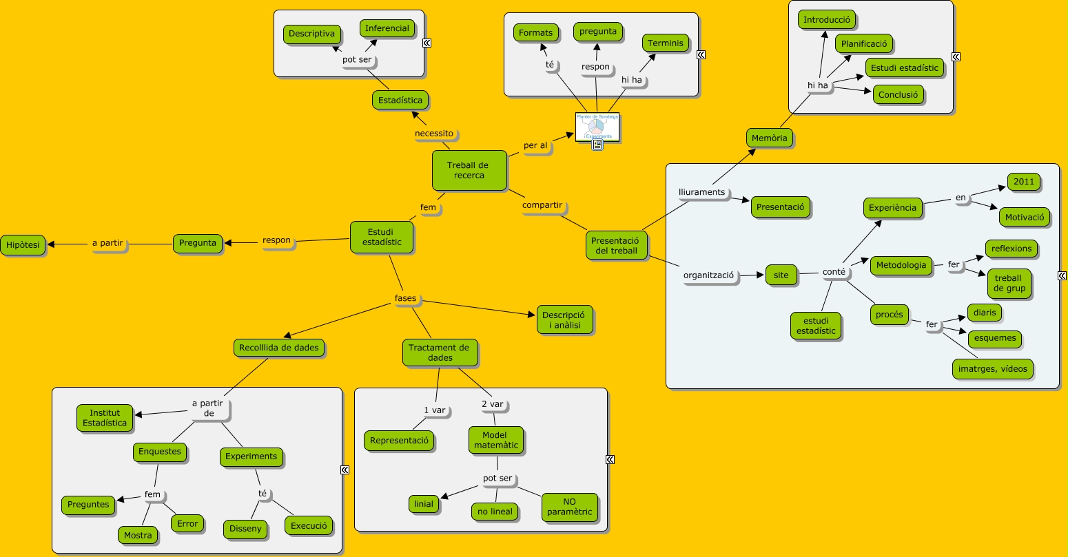 Aquest mapa conceptual conté informació relacionada amb: Treball de recerca, Presentació del treball lliuraments Memòria, Treball de recerca compartir Presentació del treball, Enquestes fem Mostra, Estudi estadístic fases Recolllida de dades, Memòria hi ha Estudi estadístic, Estadística pot ser Inferencial, respon pregunta, Presentació del treball lliuraments Presentació, Estadística pot ser Descriptiva, Presentació del treball organització site, site conté estudi estadístic, site conté Metodologia, site conté Experiència, procés fer imatrges, vídeos, Experiència en Motivació, Model matemàtic pot ser linial, Experiments té Disseny, Estudi estadístic fases Descripció i anàlisi, hi ha Terminis, té Formats