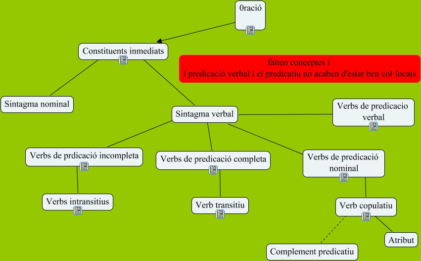 Aquest mapa conceptual conté informació relacionada amb: sintaxi, Verbs de predicació nominal ???? Verb copulatiu, Constituents inmediats ???? Sintagma verbal, Sintagma verbal ???? Verbs de predicacio verbal, Sintagma verbal ???? Verbs de predicació nominal, Constituents inmediats ???? Sintagma nominal, Sintagma verbal ???? Verbs de prdicació incompleta, Verbs de predicació completa ???? Verb transitiu, Verb copulatiu ???? Complement predicatiu, Verb copulatiu ???? Atribut, 0ració ???? Constituents inmediats, Sintagma verbal ???? Verbs de predicació completa, Verbs de prdicació incompleta ???? Verbs intransitius
