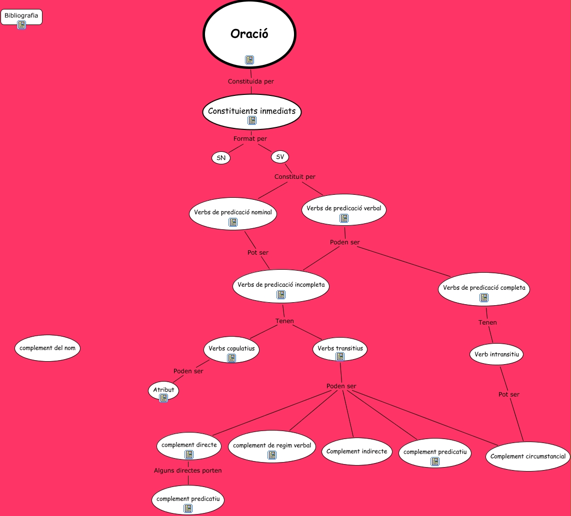Este Cmap, tiene información relacionada con: Sintaxi, Verbs de predicació completa Tenen Verb intransitiu, Verbs de predicació incompleta Tenen Verbs copulatius, Verbs transitius Poden ser complement predicatiu, Verbs transitius Poden ser complement de regim verbal, Verbs de predicació verbal Poden ser Verbs de predicació incompleta, Verbs transitius Poden ser complement directe, Verbs transitius Poden ser Complement circumstancial, SV Constituit per Verbs de predicació verbal, Verbs de predicació verbal Poden ser Verbs de predicació completa, Oració Constituida per Constituients inmediats, complement directe Alguns directes porten complement predicatiu, SV Format per SN, Verbs de predicació nominal Pot ser Verbs de predicació incompleta, Verbs de predicació nominal Constituit per Verbs de predicació verbal, Verbs de predicació incompleta Tenen Verbs transitius, Verbs transitius Poden ser Complement indirecte, Verb intransitiu Pot ser Complement circumstancial, Constituients inmediats Format per SN, Verbs copulatius Poden ser Atribut