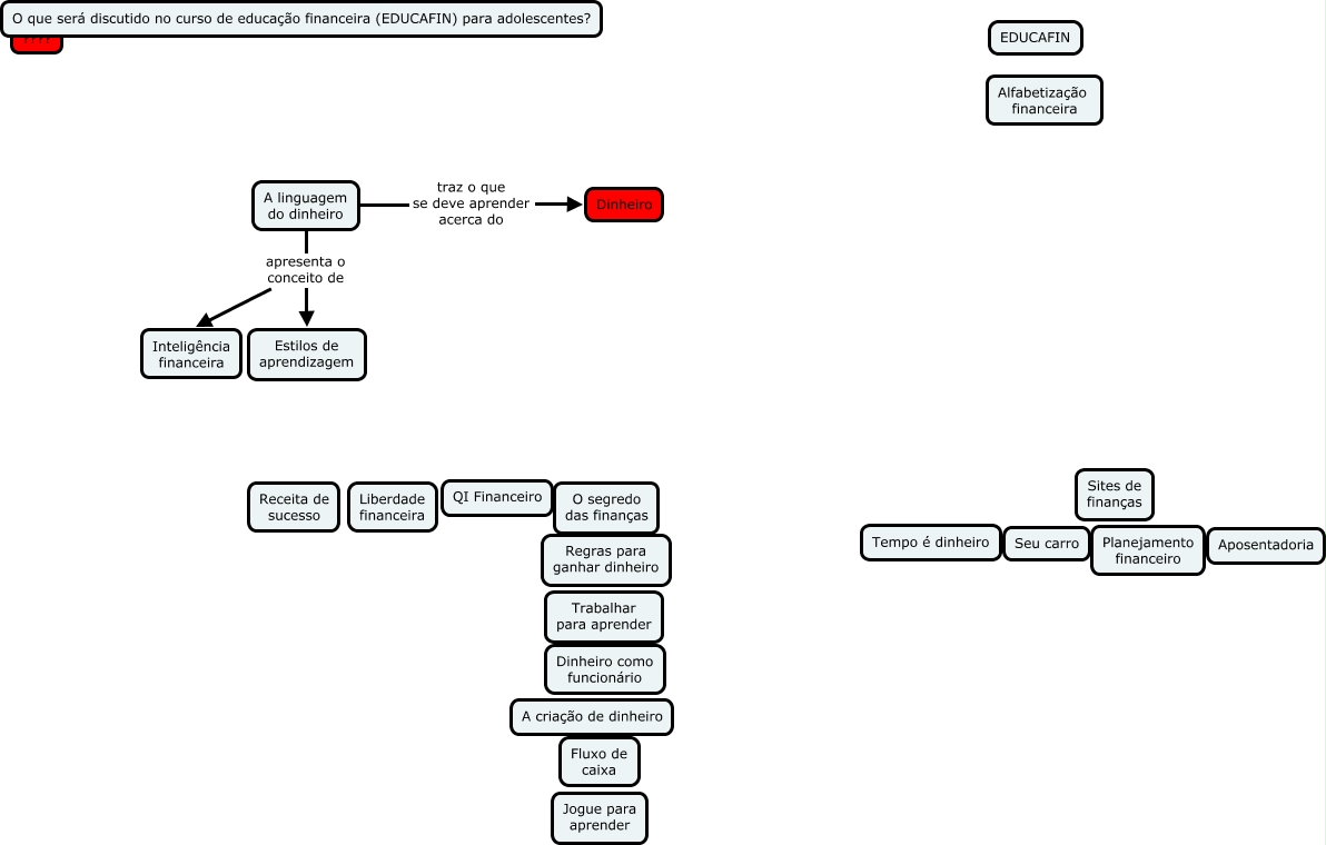 Esse mapa conceitual, produzido no IHMC CmapTools, tem a informação relacionada a: educafin, A linguagem do dinheiro apresenta o conceito de Inteligência financeira, A linguagem do dinheiro traz o que se deve aprender acerca do Dinheiro, A linguagem do dinheiro apresenta o conceito de Estilos de aprendizagem