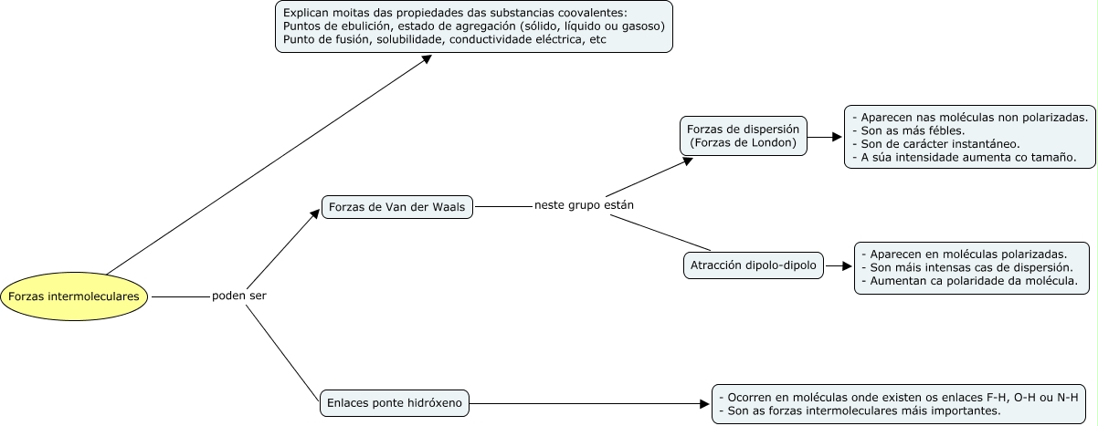Este Cmap, tiene información relacionada con: forzas_intermoleculares4eso, Enlaces ponte hidróxeno ???? - Ocorren en moléculas onde existen os enlaces F-H, O-H ou N-H - Son as forzas intermoleculares máis importantes., Atracción dipolo-dipolo ???? - Aparecen en moléculas polarizadas. - Son máis intensas cas de dispersión. - Aumentan ca polaridade da molécula., Forzas de Van der Waals neste grupo están Atracción dipolo-dipolo, Forzas de dispersión (Forzas de London) ???? - Aparecen nas moléculas non polarizadas. - Son as más fébles. - Son de carácter instantáneo. - A súa intensidade aumenta co tamaño., Forzas intermoleculares ???? Explican moitas das propiedades das substancias coovalentes: Puntos de ebulición, estado de agregación (sólido, líquido ou gasoso) Punto de fusión, solubilidade, conductividade eléctrica, etc, Forzas intermoleculares poden ser Enlaces ponte hidróxeno, Forzas intermoleculares poden ser Forzas de Van der Waals, Forzas de Van der Waals neste grupo están Forzas de dispersión (Forzas de London)