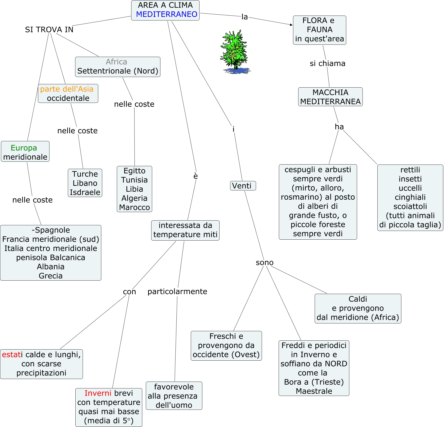 Questa Cmap, creata con IHMC CmapTools, contiene informazioni relative a: Area a clima Mediterraneo, AREA A CLIMA MEDITERRANEO i Venti, Africa Settentrionale (Nord) nelle coste Egitto Tunisia Libia Algeria Marocco, AREA A CLIMA MEDITERRANEO è interessata da temperature miti, Venti sono Freddi e periodici in Inverno e soffiano da NORD come la Bora a (Trieste) Maestrale, interessata da temperature miti con estati calde e lunghi, con scarse precipitazioni, Europa meridionale nelle coste -Spagnole Francia meridionale (sud) Italia centro meridionale penisola Balcanica Albania Grecia, AREA A CLIMA MEDITERRANEO SI TROVA IN Africa Settentrionale (Nord), interessata da temperature miti con Inverni brevi con temperature quasi mai basse (media di 5°), MACCHIA MEDITERRANEA ha rettili insetti uccelli cinghiali scoiattoli (tutti animali di piccola taglia), FLORA e FAUNA in quest'area si chiama MACCHIA MEDITERRANEA, MACCHIA MEDITERRANEA ha cespugli e arbusti sempre verdi (mirto, alloro, rosmarino) al posto di alberi di grande fusto, o piccole foreste sempre verdi, AREA A CLIMA MEDITERRANEO SI TROVA IN Europa meridionale, AREA A CLIMA MEDITERRANEO SI TROVA IN parte dell'Asia occidentale, AREA A CLIMA MEDITERRANEO la FLORA e FAUNA in quest'area, Venti sono Freschi e provengono da occidente (Ovest), interessata da temperature miti particolarmente favorevole alla presenza dell'uomo, parte dell'Asia occidentale nelle coste Turche Libano Isdraele, Venti sono Caldi e provengono dal meridione (Africa)