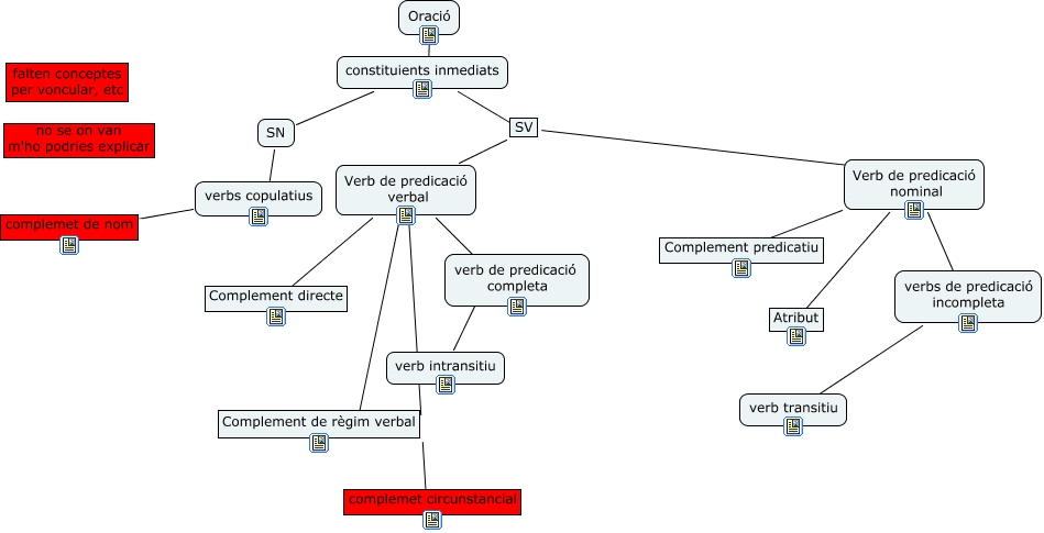 Aquest mapa conceptual conté informació relacionada amb: oració, Oració ???? constituients inmediats, constituients inmediats ???? Verb de predicació verbal, constituients inmediats ???? SV, Verb de predicació verbal ???? verb de predicació completa, constituients inmediats ???? SN, verb de predicació completa ???? verb intransitiu, verbs de predicació incompleta ???? verb transitiu, Verb de predicació verbal ???? complemet circunstancial, constituients inmediats ???? SV, Verb de predicació nominal ???? Complement predicatiu, Verb de predicació verbal ???? Complement de règim verbal, Verb de predicació nominal ???? verbs de predicació incompleta, Verb de predicació nominal ???? Atribut, SV ???? Verb de predicació nominal, SN ???? verbs copulatius, Verb de predicació verbal ???? Complement directe, verbs copulatius ???? complemet de nom