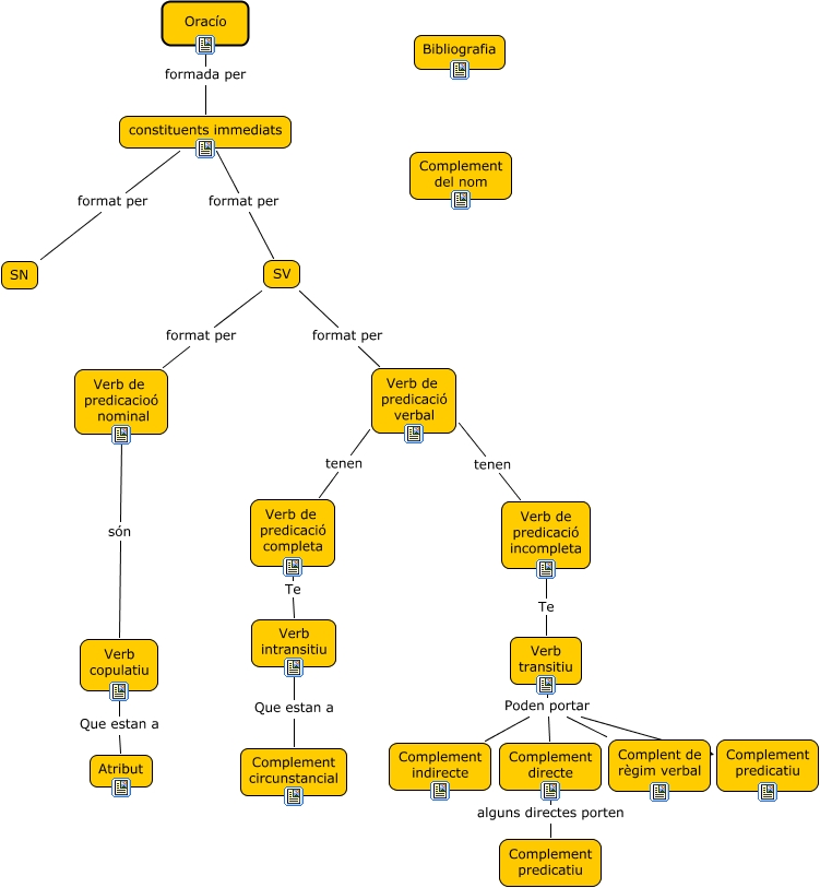 Este Cmap, tiene información relacionada con: Oració, SV format per Verb de predicació verbal, Verb de predicació completa Te Verb intransitiu, constituents immediats format per SV, Verb de predicacioó nominal són Verb copulatiu, Verb intransitiu Que estan a Complement circunstancial, Verb de predicació verbal tenen Verb de predicació incompleta, Complement directe alguns directes porten Complement predicatiu, constituents immediats format per SN, Verb transitiu Poden portar Complement predicatiu, Verb de predicació verbal tenen Verb de predicació completa, Verb transitiu Poden portar Complement directe, Verb transitiu Poden portar Complement indirecte, SV format per Verb de predicacioó nominal, Verb transitiu Poden portar Complent de règim verbal, Verb copulatiu Que estan a Atribut, Verb de predicació incompleta Te Verb transitiu, Oracío formada per constituents immediats