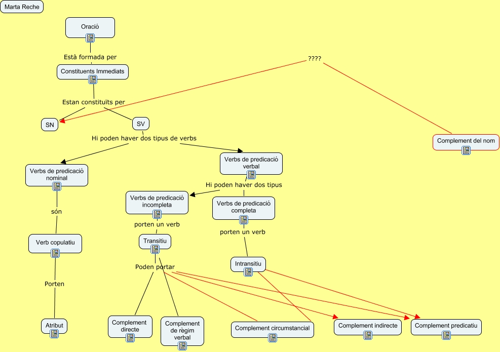 Este Cmap, tiene información relacionada con: sintaxi, Verbs de predicació completa porten un verb Intransitiu, SV Hi poden haver dos tipus de verbs Verbs de predicació verbal, Transitiu Poden portar Complement indirecte, Verbs de predicació verbal Hi poden haver dos tipus Verbs de predicació incompleta, Verbs de predicació incompleta porten un verb Transitiu, Intransitiu ???? Complement circumstancial, Constituents Immediats Estan constituïts per SV, Complement del nom ???? SN, Intransitiu ???? Complement predicatiu, Verb copulatiu Porten Atribut, Transitiu Poden portar Complement predicatiu, Transitiu Complement de règim verbal, SV Hi poden haver dos tipus de verbs Verbs de predicació nominal, Oració Està formada per Constituents Immediats, Constituents Immediats Estan constituïts per SN, Verbs de predicació verbal Hi poden haver dos tipus Verbs de predicació completa, Verbs de predicació nominal són Verb copulatiu, Transitiu Poden portar Complement directe, Transitiu Poden portar Complement circumstancial