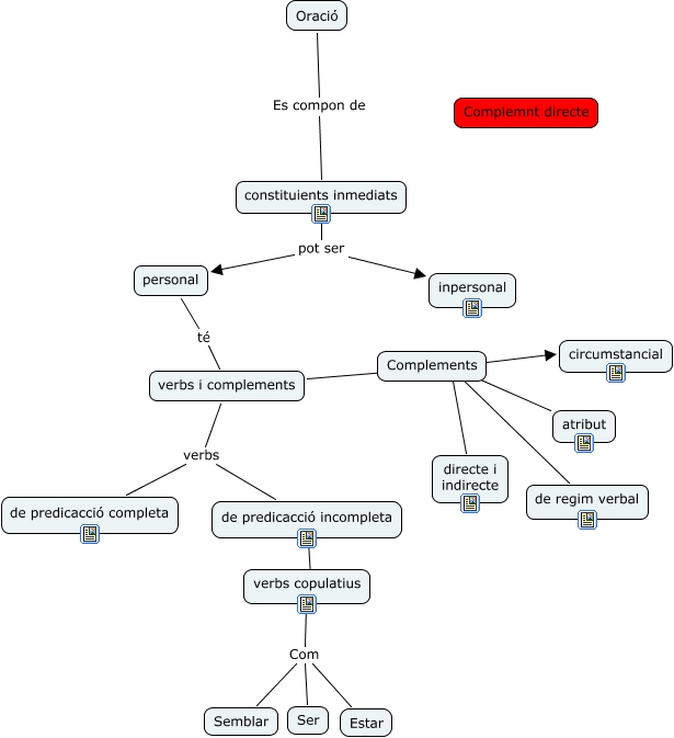 Aquest mapa conceptual conté informació relacionada amb: CMAP, verbs copulatius Com Semblar, Complements ???? directe i indirecte, Complements ???? atribut, verbs i complements verbs de predicacció completa, Complements ???? circumstancial, constituients inmediats pot ser personal, personal té verbs i complements, verbs i complements verbs de predicacció incompleta, de predicacció incompleta ???? verbs copulatius, Oració Es compon de constituients inmediats, verbs i complements ???? Complements, verbs copulatius Com Estar, verbs copulatius Com Ser, constituients inmediats pot ser inpersonal, Complements ???? de regim verbal