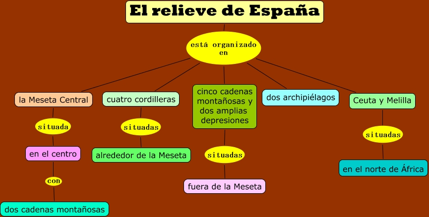 Este Cmap, tiene información relacionada con: El relieve de España, El relieve de España está organizado en dos archipiélagos, en el centro con dos cadenas montañosas, cinco cadenas montañosas y dos amplias depresiones situadas fuera de la Meseta, El relieve de España está organizado en cinco cadenas montañosas y dos amplias depresiones, cuatro cordilleras situadas alrededor de la Meseta, la Meseta Central situada en el centro, Ceuta y Melilla situadas en el norte de África, El relieve de España está organizado en Ceuta y Melilla, El relieve de España está organizado en cuatro cordilleras, El relieve de España está organizado en la Meseta Central