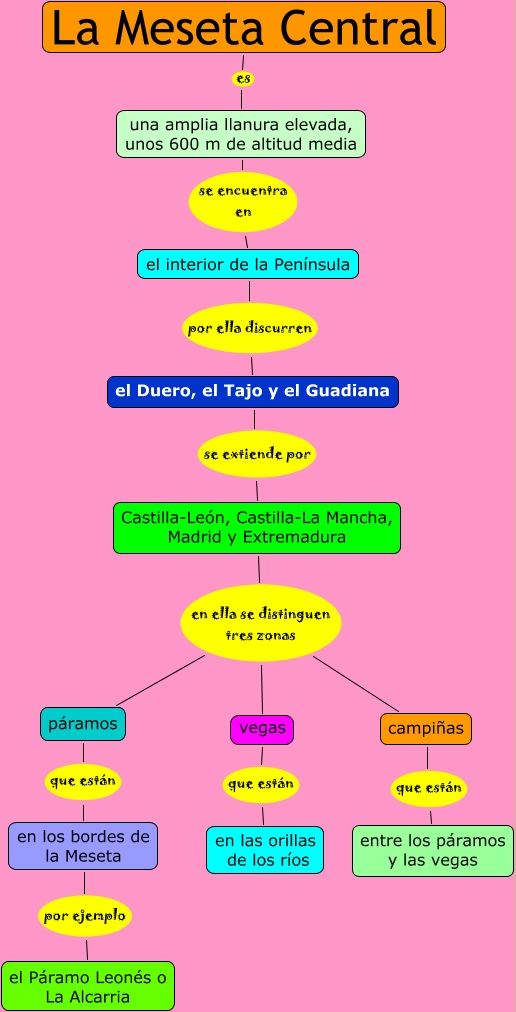 Este Cmap, tiene información relacionada con: La Meseta Central, La Meseta Central es una amplia llanura elevada, unos 600 m de altitud media, una amplia llanura elevada, unos 600 m de altitud media se encuentra en el interior de la Península, el Duero, el Tajo y el Guadiana se extiende por Castilla-León, Castilla-La Mancha, Madrid y Extremadura, en los bordes de la Meseta por ejemplo el Páramo Leonés o La Alcarria, Castilla-León, Castilla-La Mancha, Madrid y Extremadura en ella se distinguen tres zonas páramos, páramos que están en los bordes de la Meseta, el interior de la Península por ella discurren el Duero, el Tajo y el Guadiana, Castilla-León, Castilla-La Mancha, Madrid y Extremadura en ella se distinguen tres zonas vegas, Castilla-León, Castilla-La Mancha, Madrid y Extremadura en ella se distinguen tres zonas campiñas, vegas que están en las orillas de los ríos, campiñas que están entre los páramos y las vegas