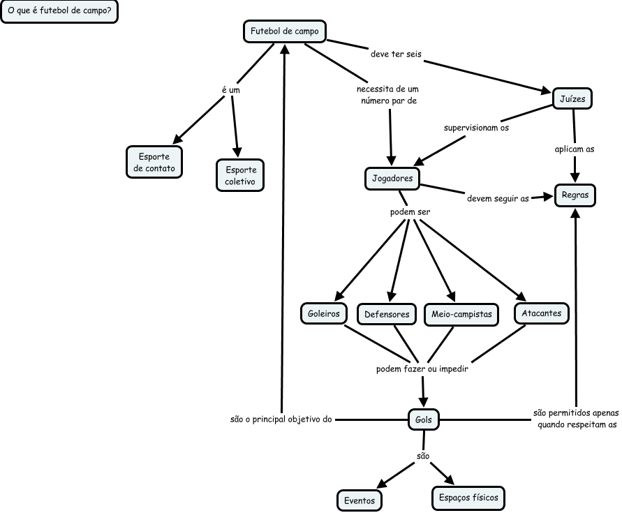 Esse mapa conceitual, produzido no IHMC CmapTools, tem a informação relacionada a: O que é futebol 2D, Jogadores devem seguir as Regras, Jogadores podem ser Defensores, Gols são o principal objetivo do Futebol de campo, Juízes supervisionam os Jogadores, Juízes aplicam as Regras, Meio-campistas podem fazer ou impedir Gols, Atacantes podem fazer ou impedir Gols, Futebol de campo é um Esporte coletivo, Futebol de campo é um Esporte de contato, Jogadores podem ser Meio-campistas, Jogadores podem ser Goleiros, Futebol de campo deve ter seis Juízes, Gols são Eventos, Defensores podem fazer ou impedir Gols, Gols são Espaços físicos, Futebol de campo necessita de um número par de Jogadores, Gols são permitidos apenas quando respeitam as Regras, Jogadores podem ser Atacantes, Goleiros podem fazer ou impedir Gols