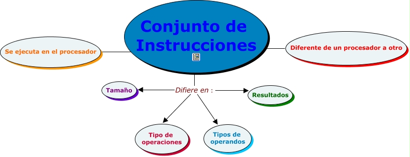 Este Cmap, tiene información relacionada con: ConjuntoInstrucciones, Conjunto de Instrucciones Difiere en: Tipo de operaciones, Conjunto de Instrucciones Difiere en: Tipos de operandos, Conjunto de Instrucciones Se ejecuta en el procesador, Conjunto de Instrucciones Difiere en: Tamaño, Conjunto de Instrucciones Difiere en: Resultados, Conjunto de Instrucciones ???? Diferente de un procesador a otro