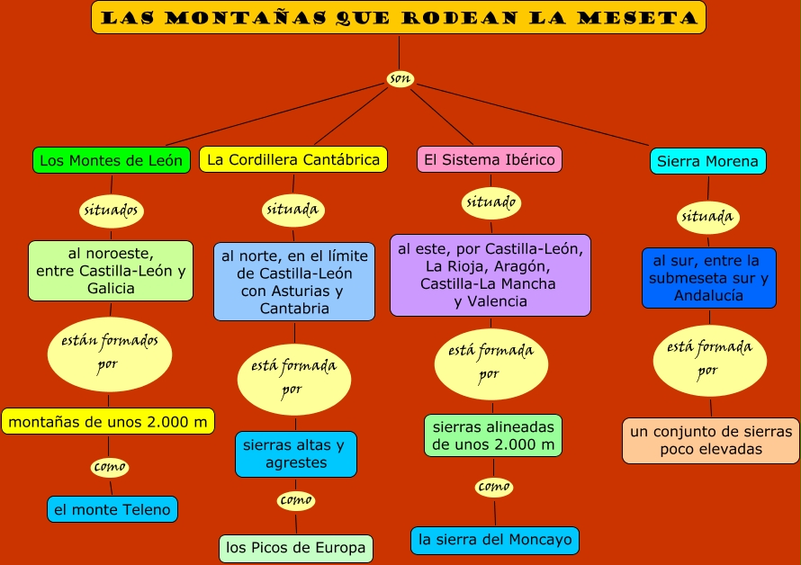 Este Cmap, tiene información relacionada con: Las montañas que rodean la Meseta, Las montañas que rodean la Meseta son Sierra Morena, El Sistema Ibérico situado al este, por Castilla-León, La Rioja, Aragón, Castilla-La Mancha y Valencia, sierras alineadas de unos 2.000 m como la sierra del Moncayo, La Cordillera Cantábrica situada al norte, en el límite de Castilla-León con Asturias y Cantabria, Las montañas que rodean la Meseta son La Cordillera Cantábrica, Las montañas que rodean la Meseta son El Sistema Ibérico, Sierra Morena situada al sur, entre la submeseta sur y Andalucía, Los Montes de León situados al noroeste, entre Castilla-León y Galicia, al este, por Castilla-León, La Rioja, Aragón, Castilla-La Mancha y Valencia está formada por sierras alineadas de unos 2.000 m, sierras altas y agrestes como los Picos de Europa, al noroeste, entre Castilla-León y Galicia están formados por montañas de unos 2.000 m, Las montañas que rodean la Meseta son Los Montes de León, al norte, en el límite de Castilla-León con Asturias y Cantabria está formada por sierras altas y agrestes, al sur, entre la submeseta sur y Andalucía está formada por un conjunto de sierras poco elevadas, montañas de unos 2.000 m como el monte Teleno