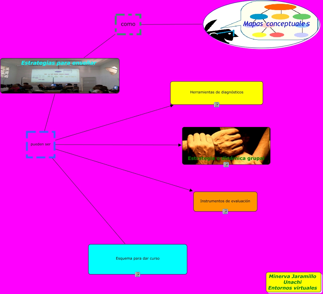 Este Cmap, tiene información relacionada con: Mapas conceptuales como estrategias de enseñanza, Mapas conceptuales como Estrategias para enseñar, Estrategias para enseñar pueden ser Estrategia o dinámica grupal, Estrategias para enseñar pueden ser Instrumentos de evaluación, Estrategias para enseñar pueden ser Esquema para dar curso, Estrategias para enseñar pueden ser Herramientas de diagnósticos