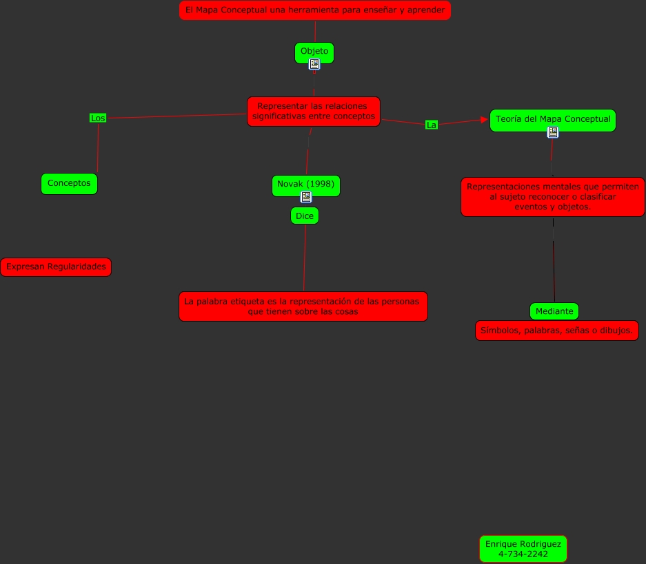 Este Cmap, tiene información relacionada con: Enrique, Representar las relaciones significativas entre conceptos Novak (1998), El Mapa Conceptual una herramienta para enseñar y aprender Objeto, Novak (1998) Dice, Representar las relaciones significativas entre conceptos Los Conceptos, Representaciones mentales que permiten al sujeto reconocer o clasificar eventos y objetos. Mediante, Representaciones mentales que permiten al sujeto reconocer o clasificar eventos y objetos. Mediante, Novak (1998) La palabra etiqueta es la representación de las personas que tienen sobre las cosas, Representar las relaciones significativas entre conceptos La Teoría del Mapa Conceptual, Objeto Representar las relaciones significativas entre conceptos, Teoría del Mapa Conceptual Representaciones mentales que permiten al sujeto reconocer o clasificar eventos y objetos.