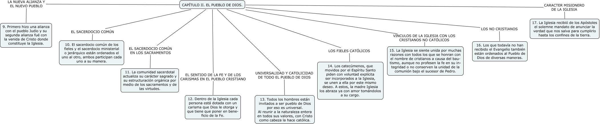 Este Cmap, tiene información relacionada con: capitulo2 lumen, CAPÍTULO II. EL PUEBLO DE DIOS. VINCULOS DE LA IGLESIA CON LOS CRISTIANOS NO CATÓLICOS 15. La Iglesia se siente unida por muchas razones con todos los que se honran con el nombre de cristianos a causa del bau- tismo, aunque no profesen la fe en su in- tegridad o no conserven la unidad de la comunión bajo el sucesor de Pedro., CAPÍTULO II. EL PUEBLO DE DIOS. EL SACERDOCIO COMÚN EN LOS SACRAMENTOS 11. La comunidad sacerdotal actualiza su carácter sagrado y su estructuración orgánica por medio de los sacramentos y de las virtudes., CAPÍTULO II. EL PUEBLO DE DIOS. UNIVERSALIDAD Y CATOLICIDAD DE TODO EL PUEBLO DE DIOS 13. Todos los hombres están invitados a ser pueblo de Dios por eso es universal. Al reunir a la naturaleza entera en todos sus valores, con Cristo como cabeza la hace católica., CAPÍTULO II. EL PUEBLO DE DIOS. LOS FIELES CATÓLICOS 14. Los catecúmenos, que movidos por el Espíritu Santo piden con voluntad explícita ser incorporados a la Iglesia, se unen a ella por este mismo deseo. A estos, la madre Iglesia los abraza ya con amor tomándolos a su cargo., CAPÍTULO II. EL PUEBLO DE DIOS. EL SACERDOCIO COMÚN 10. El sacerdocio común de los fieles y el sacerdocio ministerial o jerárquico están ordenados el uno al otro, ambos participan cada uno a su manera., CAPÍTULO II. EL PUEBLO DE DIOS. LA NUEVA ALIANZA Y EL NUEVO PUEBLO 9. Primero hizo una alianza con el pueblo Judio y su segunda alianza fué con la venida de Cristo donde constituye la Iglesia., CAPÍTULO II. EL PUEBLO DE DIOS. CARACTER MISIONERO DE LA IGLESIA 17. La Iglesia recibió de los Apóstoles el solemne mandato de anunciar la verdad que nos salva para cumplirlo hasta los confines de la tierra., CAPÍTULO II. EL PUEBLO DE DIOS. LOS NO CRISTIANOS 16. Los que todavía no han recibido el Evangelio también están ordenados al Pueblo de Dios de diversas maneras., CAPÍTULO II. EL PUEBLO DE DIOS. EL SENTIDO DE LA FE Y DE LOS CARISMAS EN EL PUEBLO CRISTIANO 12. Dentro de la Iglesia cada persona está dotada con un carisma que Dios le otorga y que tiene que poner en bene- ficio de la Fe.