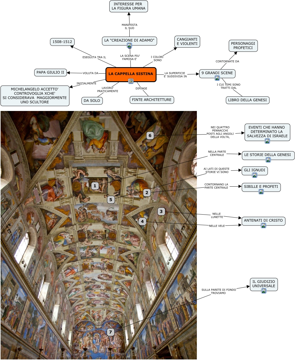 Questa Cmap, creata con IHMC CmapTools, contiene informazioni relative a: CAPPELLA SISTINA, LA CAPPELLA SISTINA ESEGUITA TRA IL 1508-1512, LA CAPPELLA SISTINA DIPINGE FINTE ARCHITETTURE, 7 SULLA PARETE DI FONDO TROVIAMO IL GIUDIZIO UNIVERSALE, LA CAPPELLA SISTINA INIZIALMENTE MICHELANGELO ACCETTO' CONTROVOGLIA XCHE' SI CONSIDERAVA MAGGIORMENTE UNO SCULTORE, 6 NEI QUATTRO PENNACCHI POSTI AGLI ANGOLI DELLA VOLTA, EVENTI CHE HANNO DETERMINATO LA SALVEZZA DI ISRAELE, 2 CONTORNANO LA PARTE CENTRALE SIBILLE E PROFETI, LA CAPPELLA SISTINA LAVORO' PRATICAMENTE DA SOLO, 5 AI LATI DI QUESTE STORIE VI SONO GLI IGNUDI, LA CAPPELLA SISTINA LA SUPERFICIE E' SUDDIVISA IN 9 GRANDI SCENE, LA "CREAZIONE DI ADAMO" MANIFESTA IL SUO INTERESSE PER LA FIGURA UMANA, LA CAPPELLA SISTINA I COLORI SONO CANGIANTI E VIOLENTI, LA CAPPELLA SISTINA LA SCENA PIU' FAMOSA E' LA "CREAZIONE DI ADAMO", 4 NELLE VELE ANTENATI DI CRISTO, 3 NELLE LUNETTE ANTENATI DI CRISTO, 1 NELLA PARTE CENTRALE LE STORIE DELLA GENESI, 9 GRANDI SCENE I CUI TEMI SONO TRATTI DAL LIBRO DELLA GENESI, LA CAPPELLA SISTINA VOLUTA DA PAPA GIULIO II, 9 GRANDI SCENE CONTORNATE DA PERSONAGGI PROFETICI