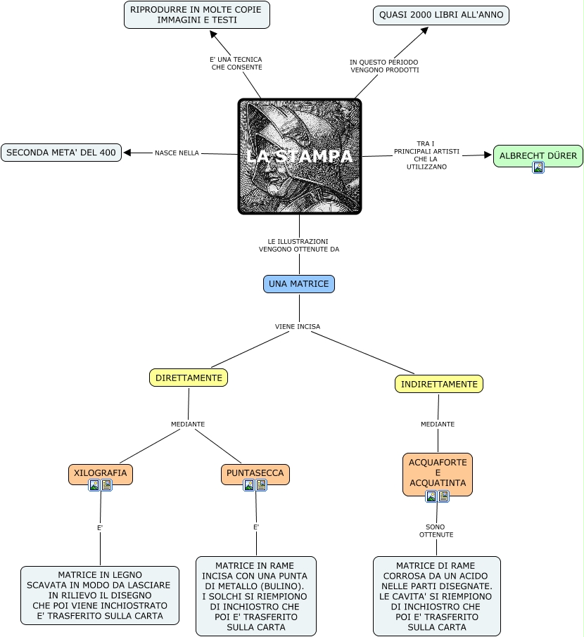 Questa Cmap, creata con IHMC CmapTools, contiene informazioni relative a: LA STAMPA, XILOGRAFIA E' MATRICE IN LEGNO SCAVATA IN MODO DA LASCIARE IN RILIEVO IL DISEGNO CHE POI VIENE INCHIOSTRATO E' TRASFERITO SULLA CARTA, DIRETTAMENTE MEDIANTE XILOGRAFIA, LA STAMPA LE ILLUSTRAZIONI VENGONO OTTENUTE DA UNA MATRICE, LA STAMPA NASCE NELLA SECONDA META' DEL 400, UNA MATRICE VIENE INCISA INDIRETTAMENTE, LA STAMPA IN QUESTO PERIODO VENGONO PRODOTTI QUASI 2000 LIBRI ALL'ANNO, LA STAMPA TRA I PRINCIPALI ARTISTI CHE LA UTILIZZANO ALBRECHT DÜRER, PUNTASECCA E' MATRICE IN RAME INCISA CON UNA PUNTA DI METALLO (BULINO). I SOLCHI SI RIEMPIONO DI INCHIOSTRO CHE POI E' TRASFERITO SULLA CARTA, ACQUAFORTE E ACQUATINTA SONO OTTENUTE MATRICE DI RAME CORROSA DA UN ACIDO NELLE PARTI DISEGNATE. LE CAVITA' SI RIEMPIONO DI INCHIOSTRO CHE POI E' TRASFERITO SULLA CARTA, DIRETTAMENTE MEDIANTE PUNTASECCA, UNA MATRICE VIENE INCISA DIRETTAMENTE, LA STAMPA E' UNA TECNICA CHE CONSENTE RIPRODURRE IN MOLTE COPIE IMMAGINI E TESTI, INDIRETTAMENTE MEDIANTE ACQUAFORTE E ACQUATINTA