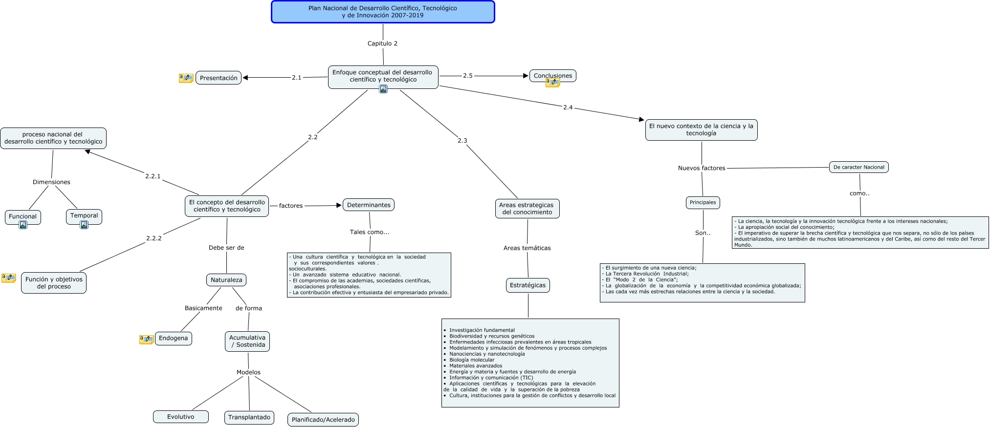 Este Cmap, tiene información relacionada con: Plan Nacional, Enfoque conceptual del desarrollo científico y tecnológico 2.2 El concepto del desarrollo científico y tecnológico, El nuevo contexto de la ciencia y la tecnología Nuevos factores Principales, Areas estrategicas del conocimiento Areas temáticas Estratégicas, Acumulativa / Sostenida Modelos Planificado/Acelerado, Enfoque conceptual del desarrollo científico y tecnológico 2.3 Areas estrategicas del conocimiento, Enfoque conceptual del desarrollo científico y tecnológico 2.4 El nuevo contexto de la ciencia y la tecnología, proceso nacional del desarrollo científico y tecnológico Dimensiones Temporal, Acumulativa / Sostenida Modelos Transplantado, Plan Nacional de Desarrollo Científico, Tecnológico y de Innovación 2007-2019 Capitulo 2 Enfoque conceptual del desarrollo científico y tecnológico, Naturaleza de forma Acumulativa / Sostenida, Principales Son.. - El surgimiento de una nueva ciencia; - La Tercera Revolución Industrial; - El “Modo 2 de la Ciencia”; - La globalización de la economía y la competitividad económica globalizada; - Las cada vez más estrechas relaciones entre la ciencia y la sociedad., Acumulativa / Sostenida Modelos Evolutivo, El nuevo contexto de la ciencia y la tecnología Nuevos factores De caracter Nacional, El concepto del desarrollo científico y tecnológico Debe ser de Naturaleza, El concepto del desarrollo científico y tecnológico factores Determinantes, Enfoque conceptual del desarrollo científico y tecnológico 2.5 Conclusiones, Enfoque conceptual del desarrollo científico y tecnológico 2.1 Presentación, Estratégicas Son • Investigación fundamental • Biodiversidad y recursos genéticos • Enfermedades infecciosas prevalentes en áreas tropicales • Modelamiento y simulación de fenómenos y procesos complejos • Nanociencias y nanotecnología • Biología molecular • Materiales avanzados • Energía y materia y fuentes y desarrollo de energía • Información y comunicación (TIC) • Aplicaciones científicas y tecnológicas para la elevación de la calidad de vida y la superación de la pobreza • Cultura, instituciones para la gestión de conflictos y desarrollo local, proceso nacional del desarrollo científico y tecnológico Dimensiones Funcional, El concepto del desarrollo científico y tecnológico 2.2.2 Función y objetivos del proceso
